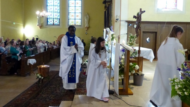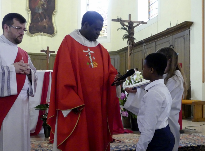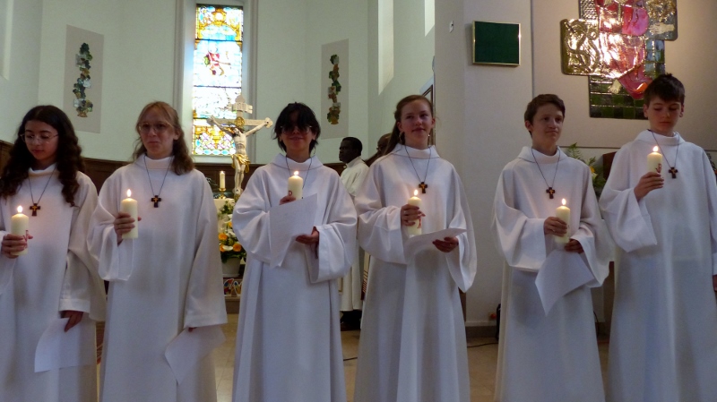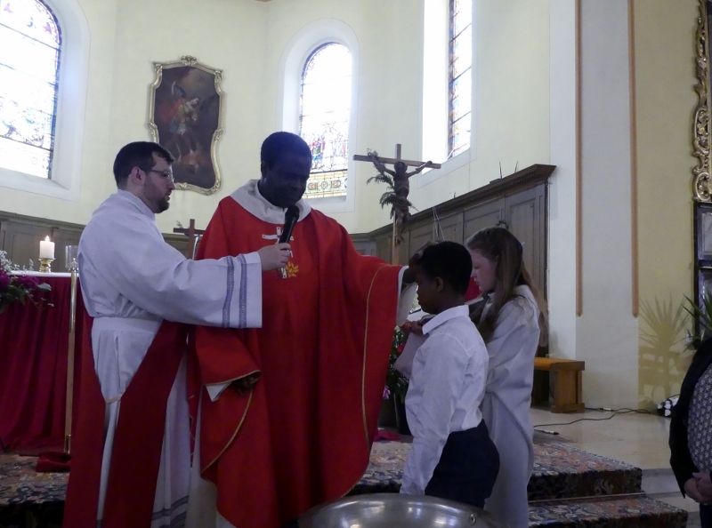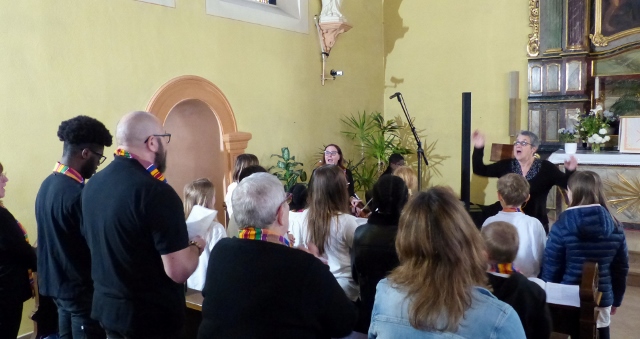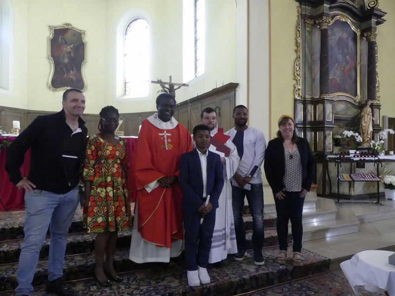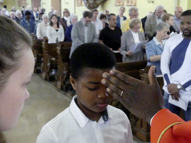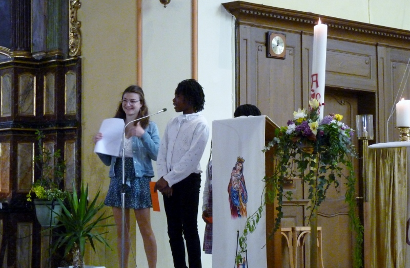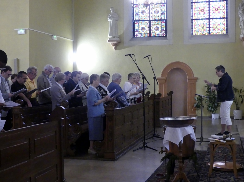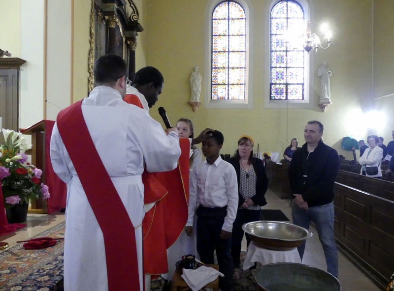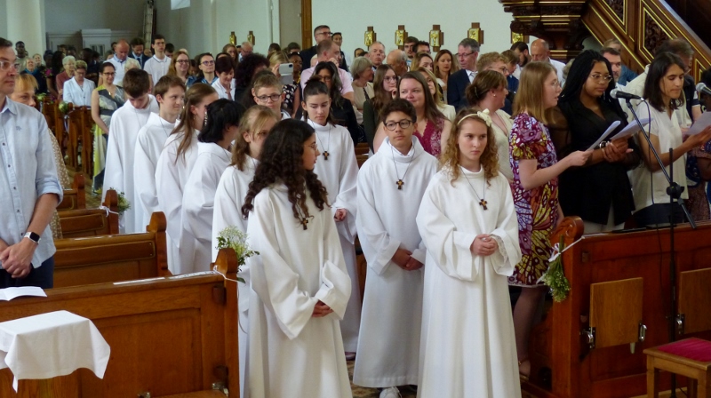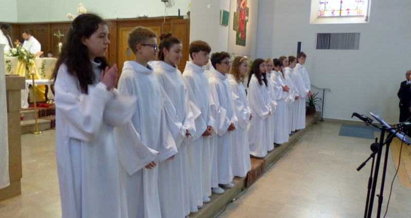 Alors que, lors de la messe anticipée de la solennité de la Très Sainte Trinité, Isabelle, notre chef de choeur de la chorale interparoissiale Sainte-Cécile, et son époux Denis Schreiber se voyaient bénis par le père Gabriel à l’occasion de leurs trente-cinq ans de mariage fêtés en ce jour, la messe du dimanche à l’église Saint-Georges voyait la célébration de la profession de foi de douze de nos adolescents. La messe était animée par les ensembles Séraphins et Vases d’argile. L’un d’eux, Victor, a effectué à cette occasion sa première communion et, à l’issue de la célébration, le père Gabriel a béni le bébé d’un couple membre de la chorale des Séraphins.