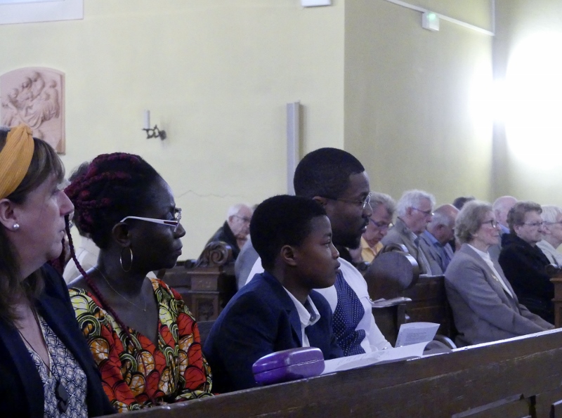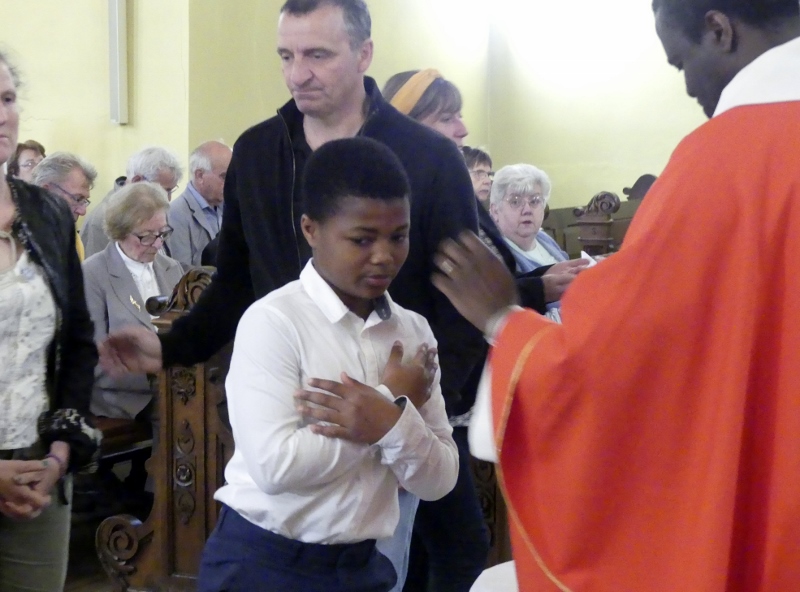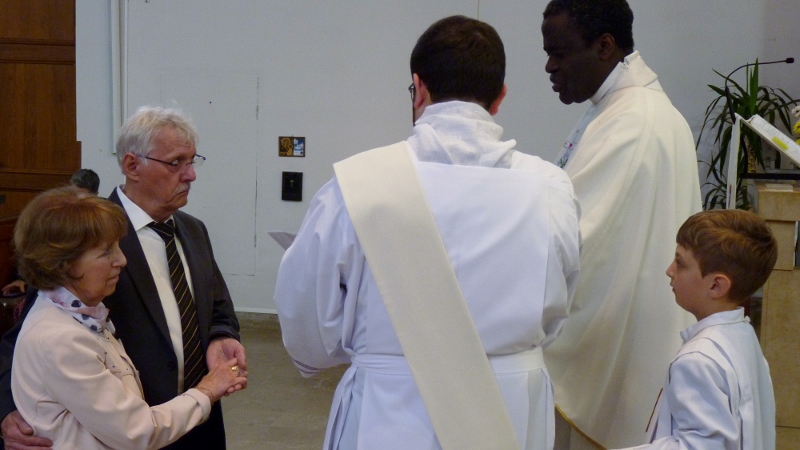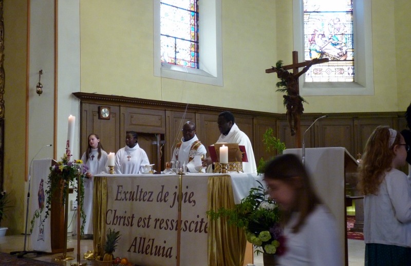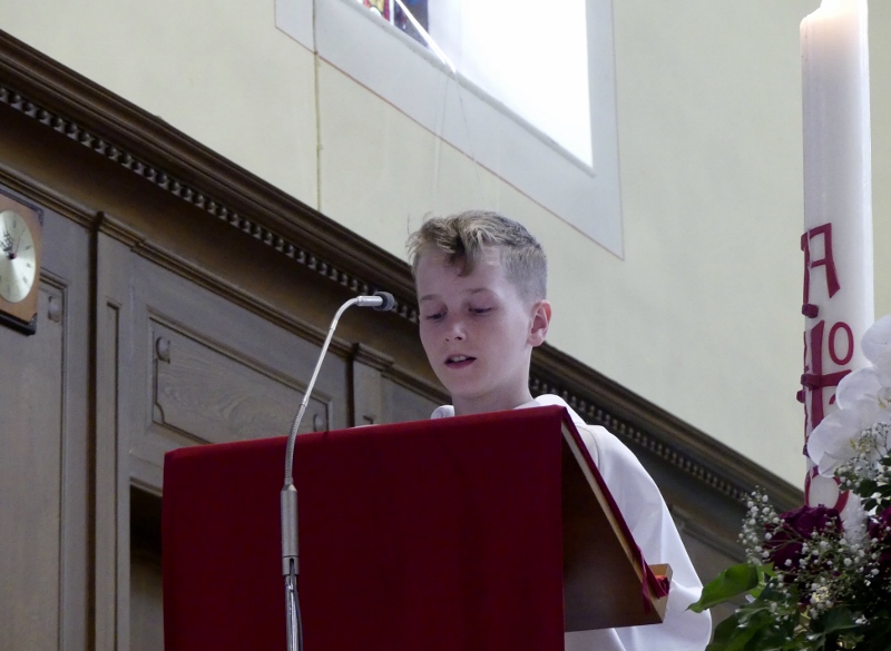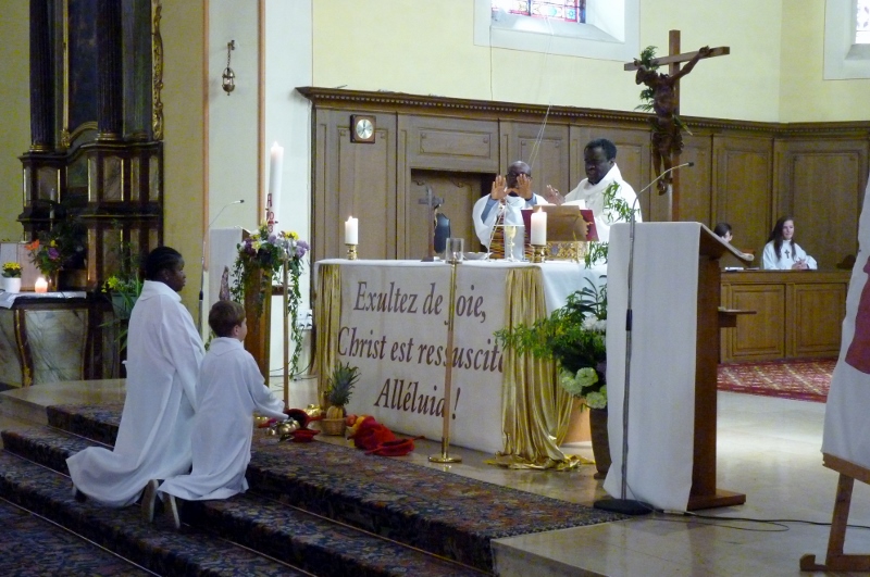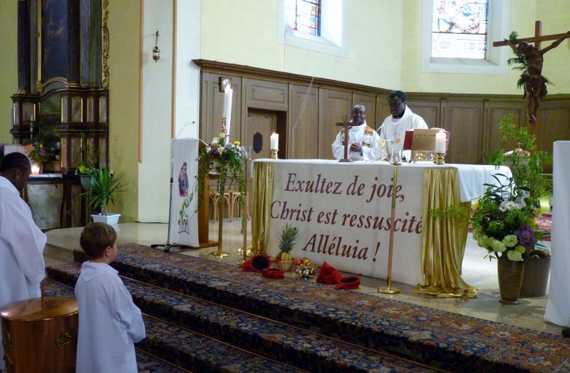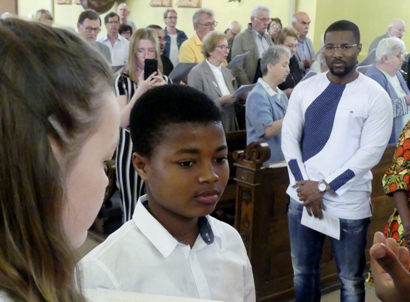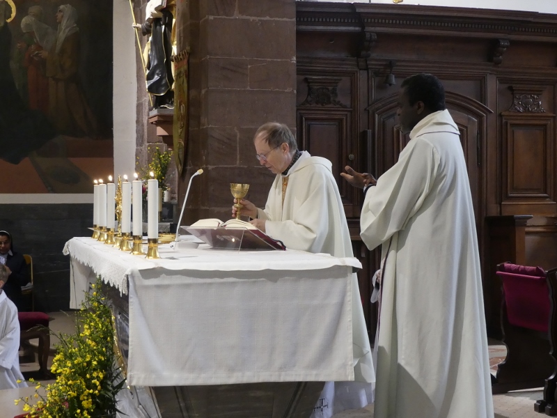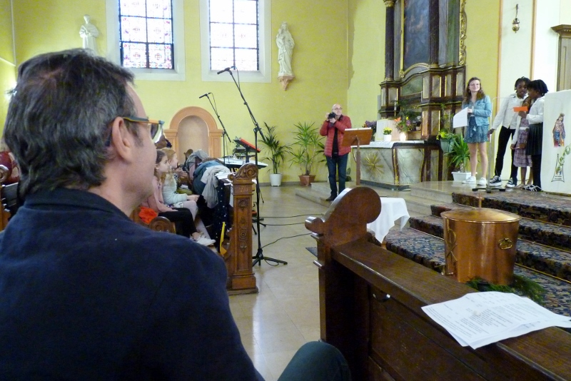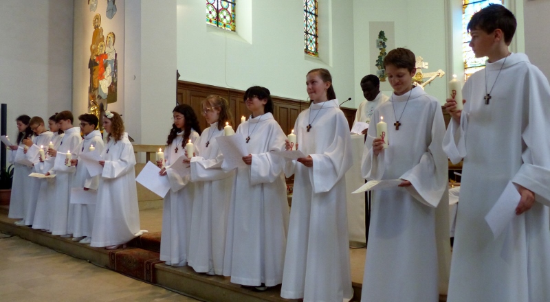 Alors que, lors de la messe anticipée de la solennité de la Très Sainte Trinité, Isabelle, notre chef de choeur de la chorale interparoissiale Sainte-Cécile, et son époux Denis Schreiber se voyaient bénis par le père Gabriel à l’occasion de leurs trente-cinq ans de mariage fêtés en ce jour, la messe du dimanche à l’église Saint-Georges voyait la célébration de la profession de foi de douze de nos adolescents. La messe était animée par les ensembles Séraphins et Vases d’argile. L’un d’eux, Victor, a effectué à cette occasion sa première communion et, à l’issue de la célébration, le père Gabriel a béni le bébé d’un couple membre de la chorale des Séraphins.