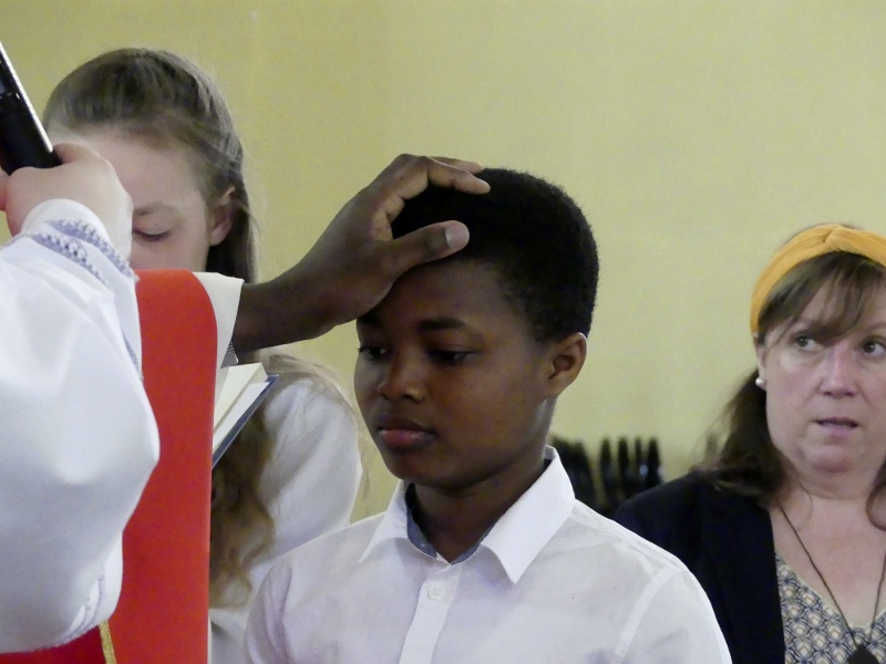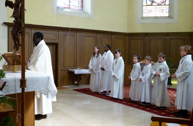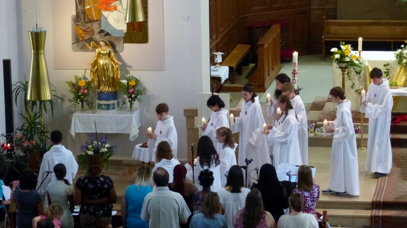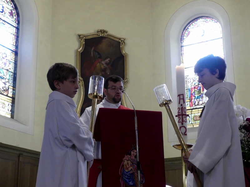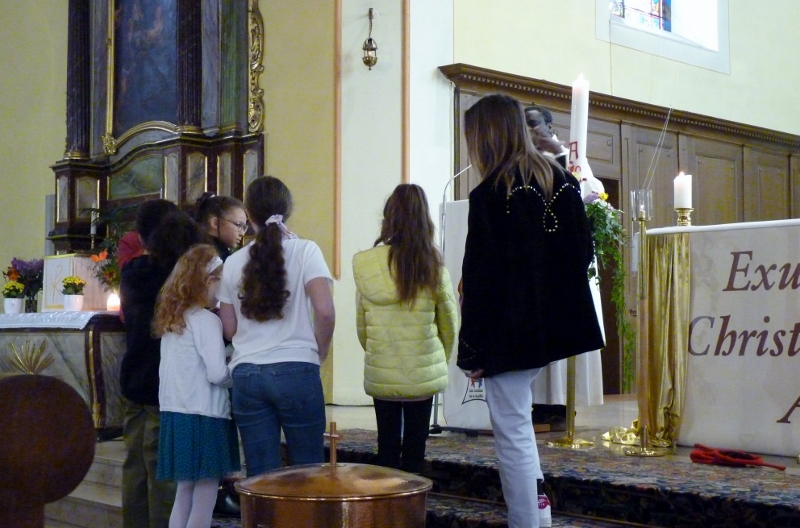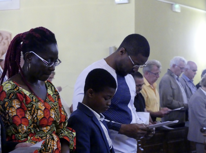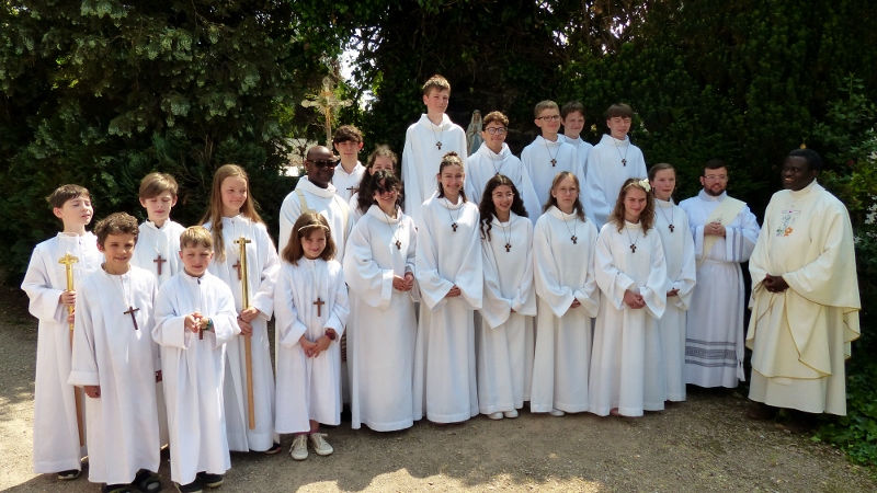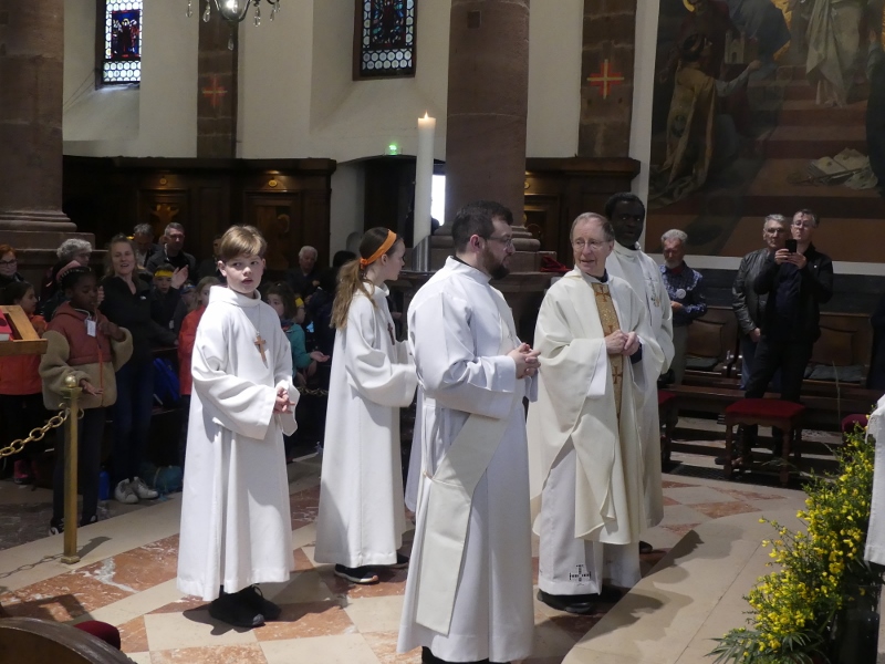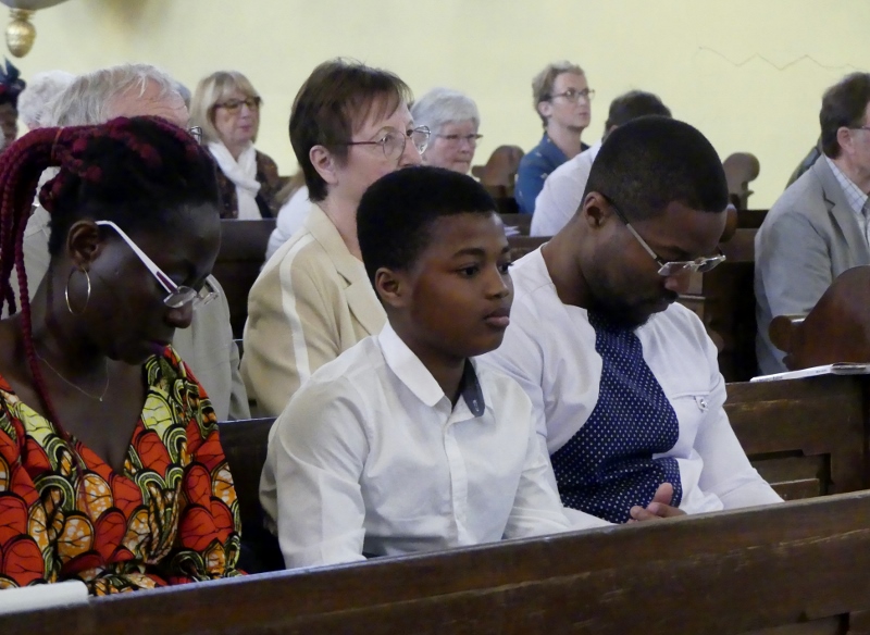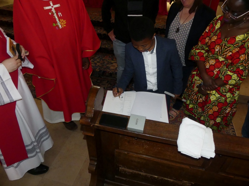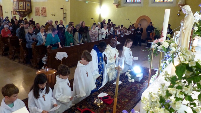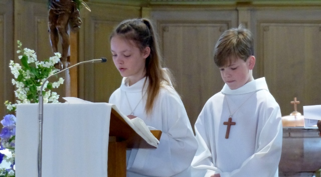 Alors que, lors de la messe anticipée de la solennité de la Très Sainte Trinité, Isabelle, notre chef de choeur de la chorale interparoissiale Sainte-Cécile, et son époux Denis Schreiber se voyaient bénis par le père Gabriel à l’occasion de leurs trente-cinq ans de mariage fêtés en ce jour, la messe du dimanche à l’église Saint-Georges voyait la célébration de la profession de foi de douze de nos adolescents. La messe était animée par les ensembles Séraphins et Vases d’argile. L’un d’eux, Victor, a effectué à cette occasion sa première communion et, à l’issue de la célébration, le père Gabriel a béni le bébé d’un couple membre de la chorale des Séraphins.
