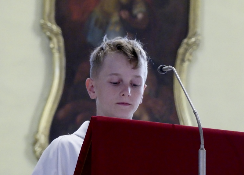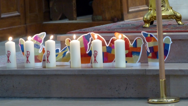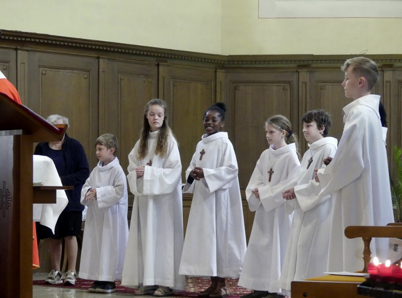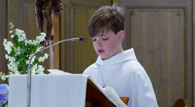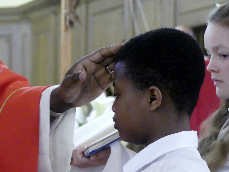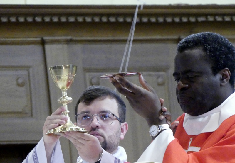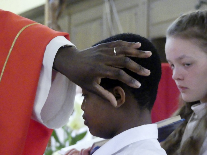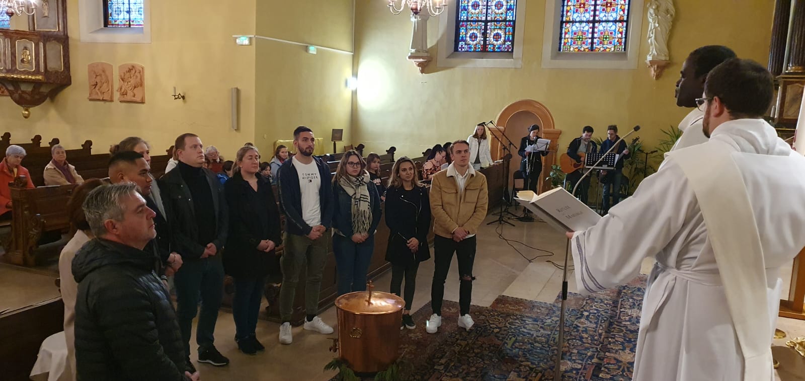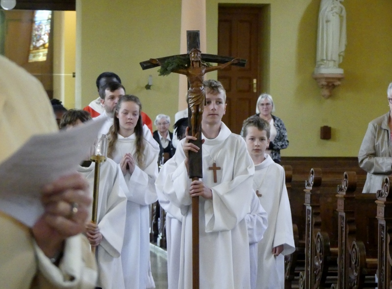 Alors que, lors de la messe anticipée de la solennité de la Très Sainte Trinité, Isabelle, notre chef de choeur de la chorale interparoissiale Sainte-Cécile, et son époux Denis Schreiber se voyaient bénis par le père Gabriel à l’occasion de leurs trente-cinq ans de mariage fêtés en ce jour, la messe du dimanche à l’église Saint-Georges voyait la célébration de la profession de foi de douze de nos adolescents. La messe était animée par les ensembles Séraphins et Vases d’argile. L’un d’eux, Victor, a effectué à cette occasion sa première communion et, à l’issue de la célébration, le père Gabriel a béni le bébé d’un couple membre de la chorale des Séraphins.