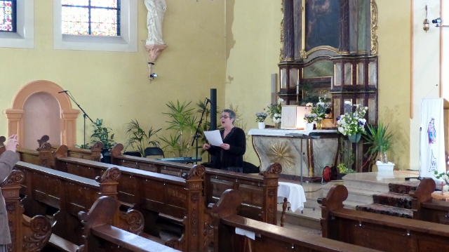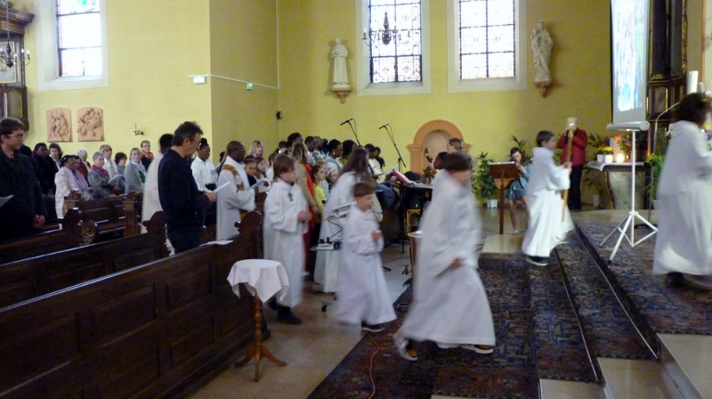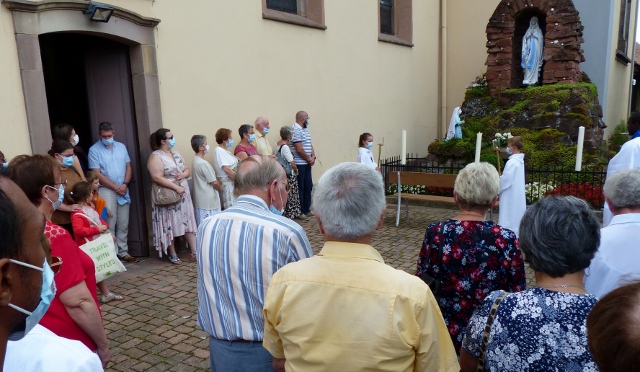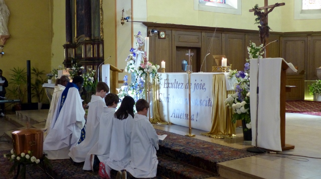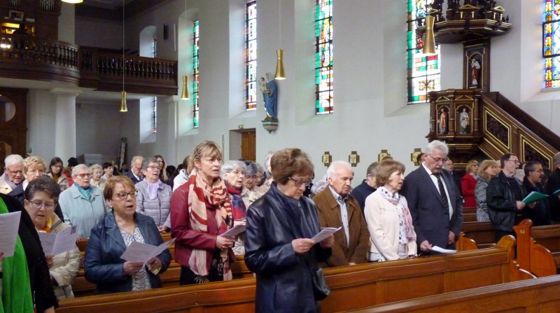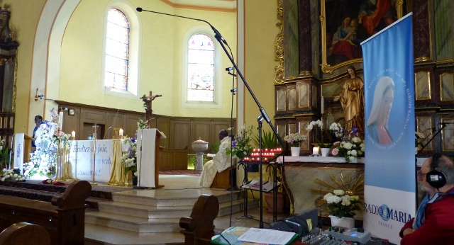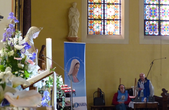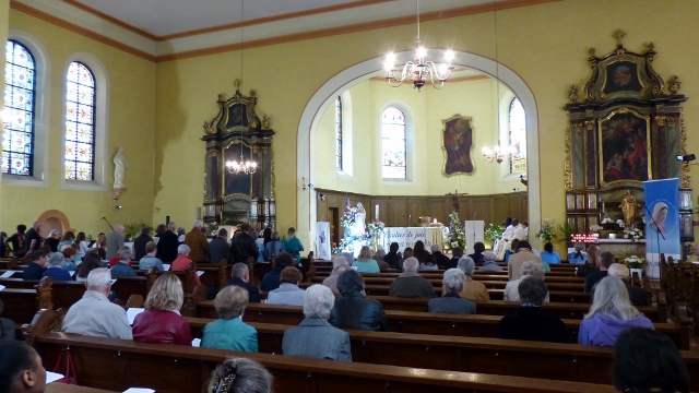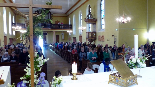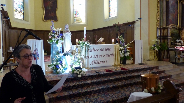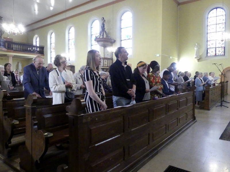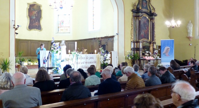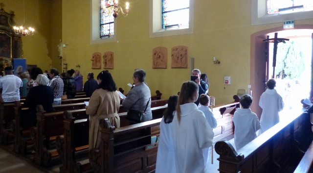 Le dimanche 14 mai la communauté de paroisses des Boucles de la Souffel a célébré lors d’une messe dominicale unique sa consécration à Notre Dame de la Paix sous le patronage de laquelle elle a été placée lors de sa création. Cette messe mariale annuelle célébrée avec toutes les chorales paroisssiales réunies placées sous la direction d’Isabelle Schreiber a été retransmise en direct pour toutes les antennes francophones de Radio Maria dont l’équipe de Strasbourg était venue sur place assurer la retransmission. Dans le choeur avait pris place une satue de Marie offerte à la communauté par une généreuse donatrice. La messe a été suivie d’une procession et d’une prière à la grotte de Lourdes jouxtant l’église. Le conseil de fabrique avait préparé un apéritif servi sur le parvis.