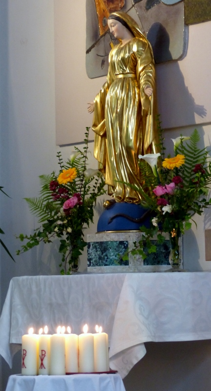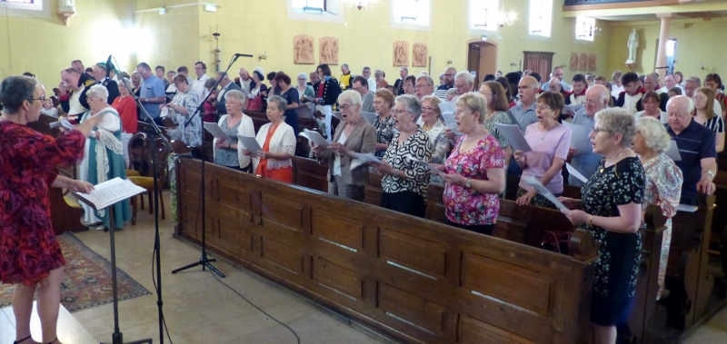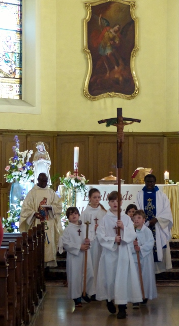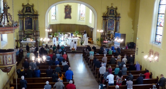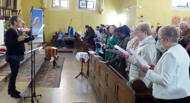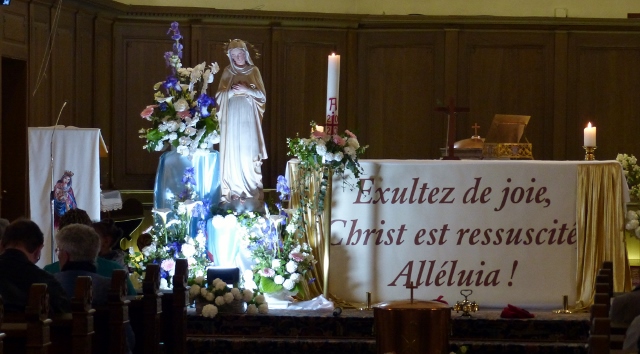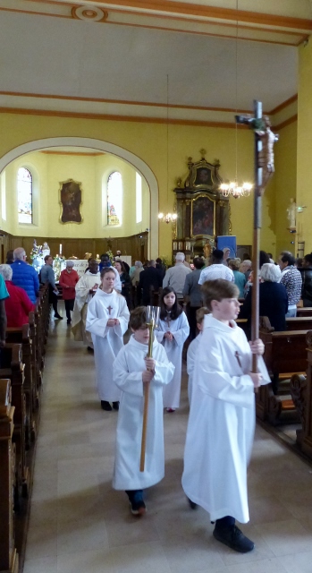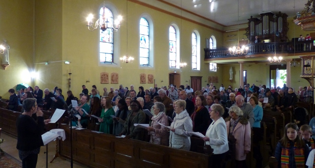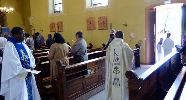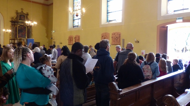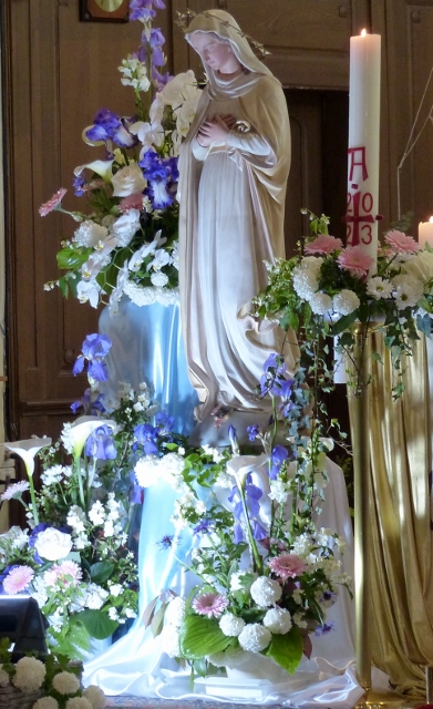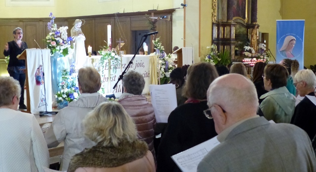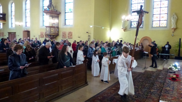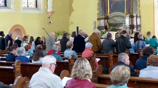 Le dimanche 14 mai la communauté de paroisses des Boucles de la Souffel a célébré lors d’une messe dominicale unique sa consécration à Notre Dame de la Paix sous le patronage de laquelle elle a été placée lors de sa création. Cette messe mariale annuelle célébrée avec toutes les chorales paroisssiales réunies placées sous la direction d’Isabelle Schreiber a été retransmise en direct pour toutes les antennes francophones de Radio Maria dont l’équipe de Strasbourg était venue sur place assurer la retransmission. Dans le choeur avait pris place une satue de Marie offerte à la communauté par une généreuse donatrice. La messe a été suivie d’une procession et d’une prière à la grotte de Lourdes jouxtant l’église. Le conseil de fabrique avait préparé un apéritif servi sur le parvis.