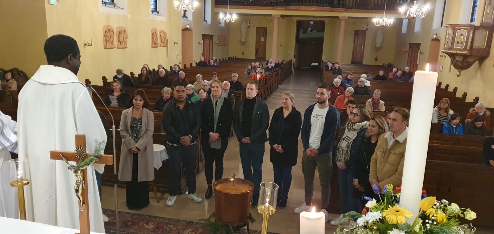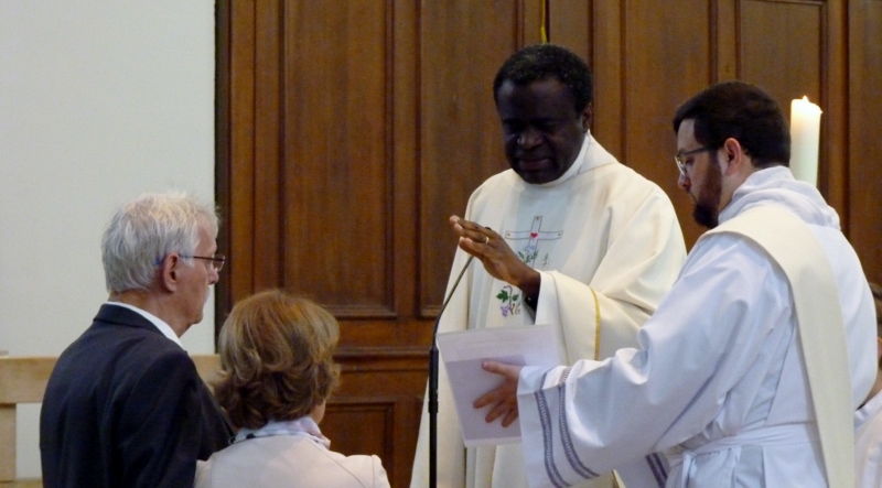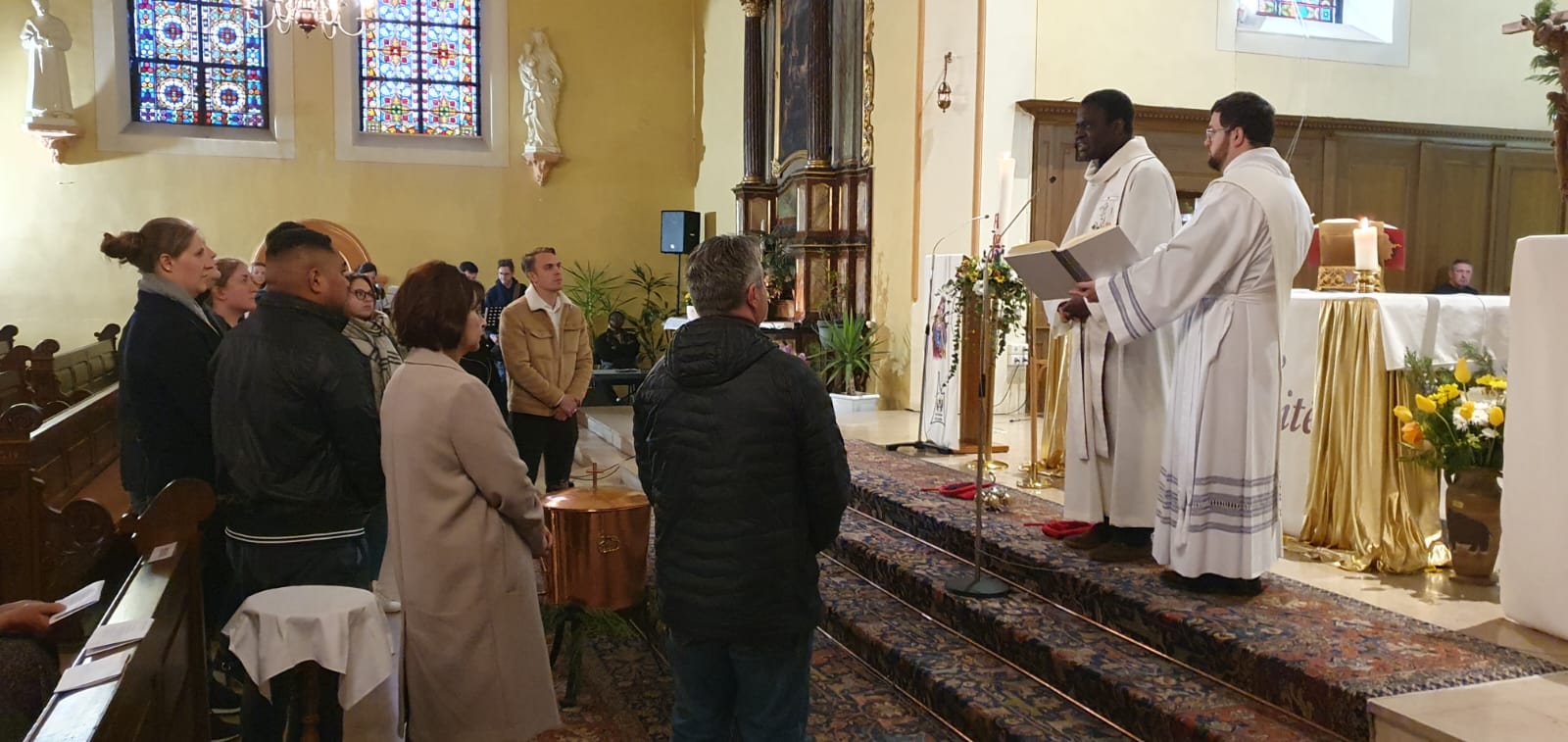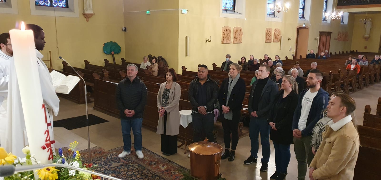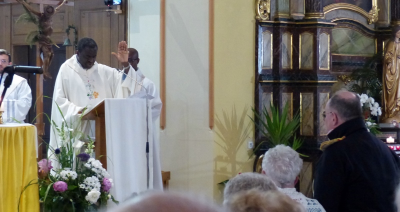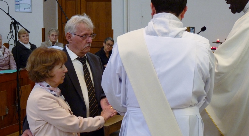 Ce dimanche 23 avril a été célébrée, animée par la chorale Sainte-Cécile avec Epiphane à l’orgue, la fête patronale de la paroisse Saint-Georges de Souffelweyersheim. A cette occasion les époux Gabriel et Marie-Thérèse (Maïté) Huber, bien connus et actifs dans la paroisse, ont fêté leurs noces d’or. Autour de notre curé l’abbé Gabriel Tchonang étaient présents notre diacre Ephraïm De La Rosa Alaniz (qui a prononcé l’homélie) et les abbés René Awoumé et Albert Nouati, notre ancien curé. Celui-ci a chanté avec Raphaëlle Meyer un hymne des noces d’or en l’honneur des deux jubilaires. Raphaëlle a magnifiquement interprété en solo en fin de célébration l’Ave Maria. Puis le père Gabriel a annoncé les prochaines échéances paroissiales, en particulier la veillée avec la fraternité Notre Dame Mère de la Lumière ce vendredi 28 avril dès 19h30. A cette occasion la messe du 28 a été avancée à 17h. Des flyers sont disponibles à l’église pour diffusion.