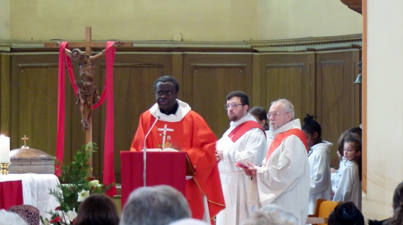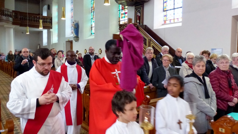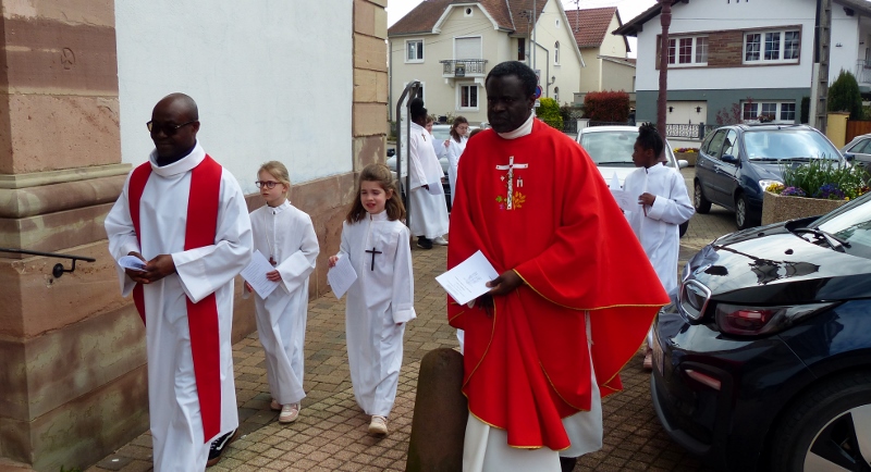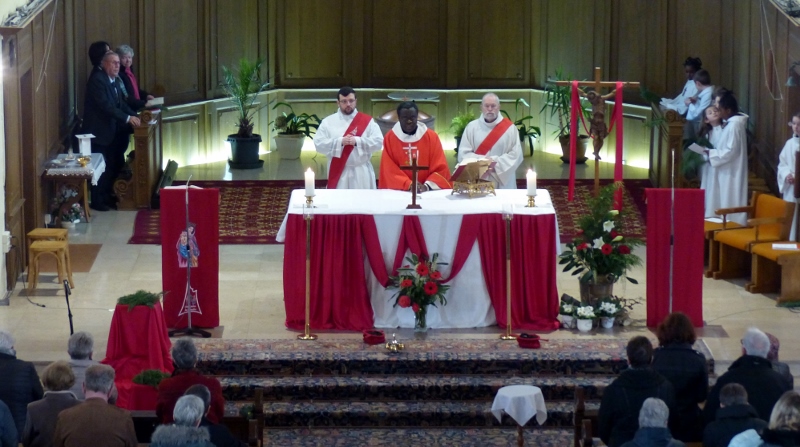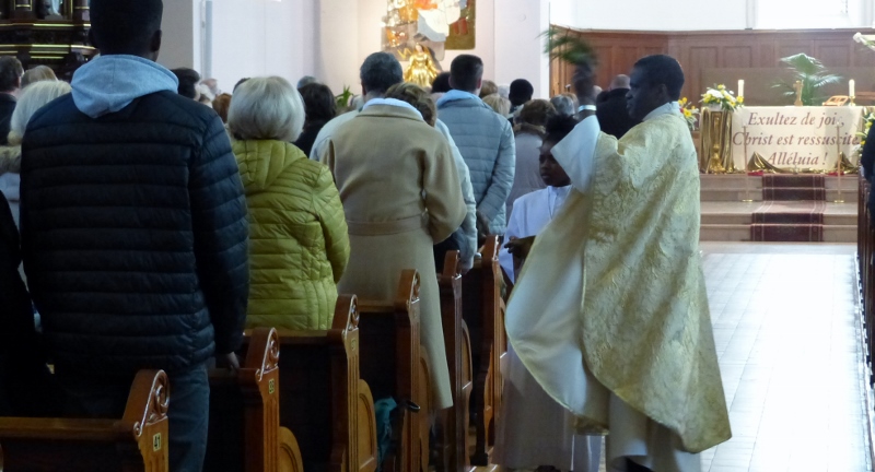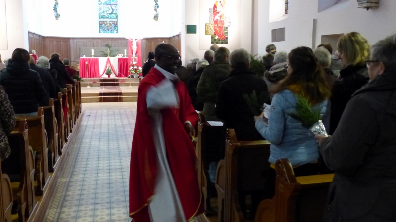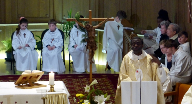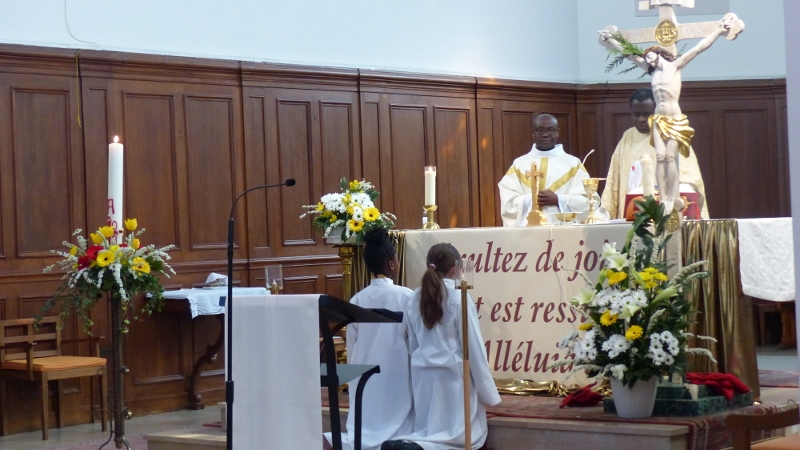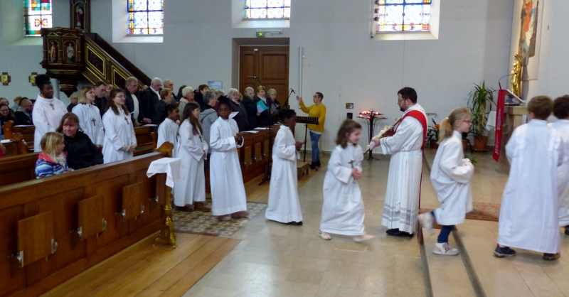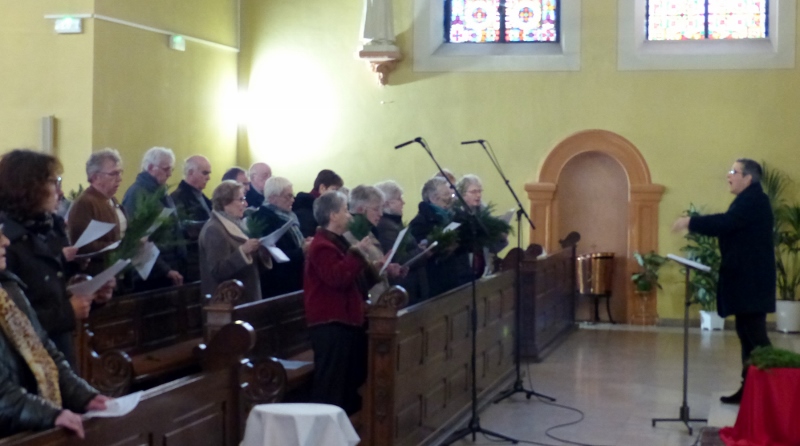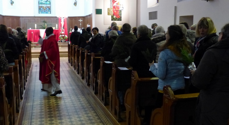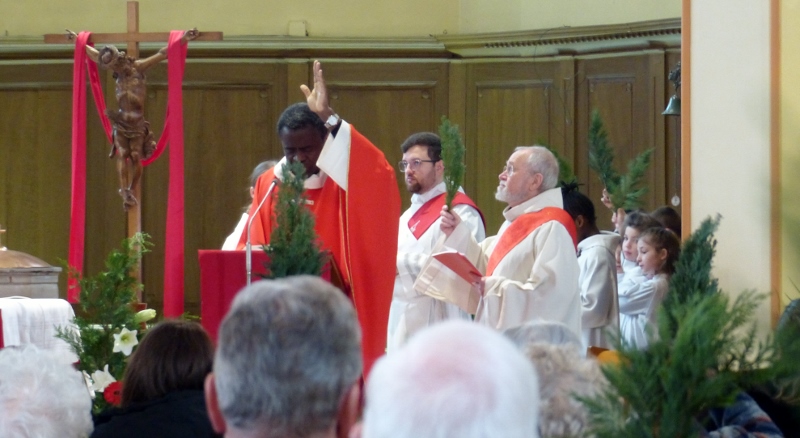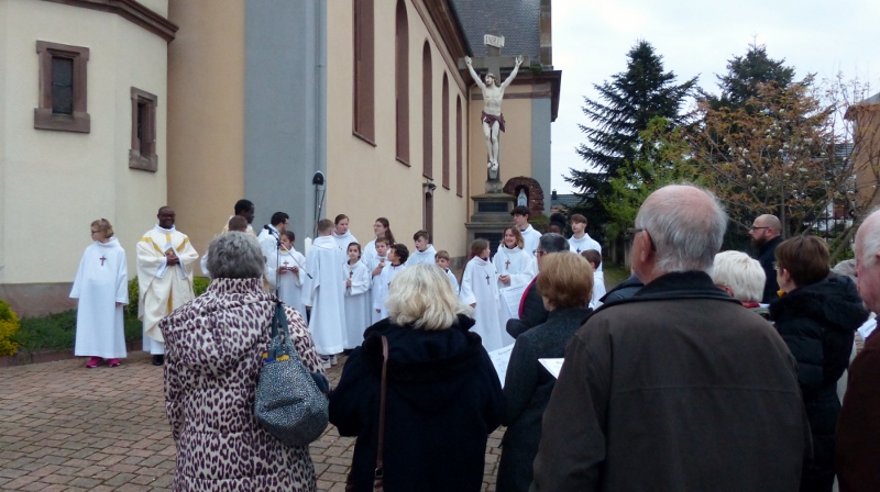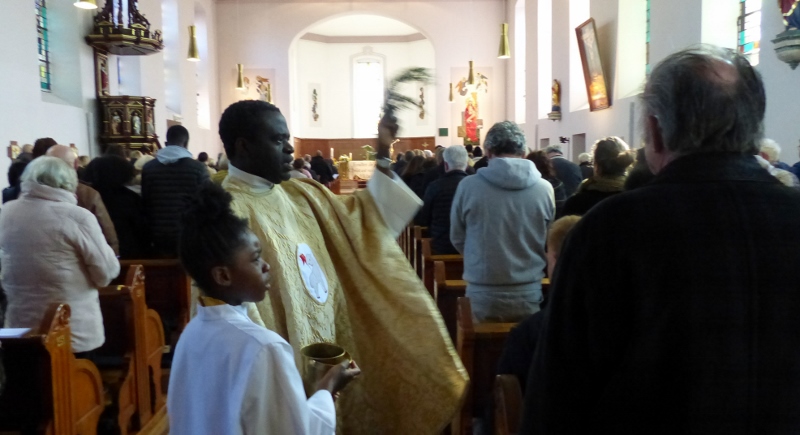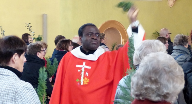 La messe des Rameaux et de la Passion a été présidée le samedi soir à Souffelweyersheim par l’abbé René Awoumé assisté de notre diacre Ephraïm avec au chant la chorale des Coeurs chantants. Le dimanche c’est notre curé l’abbé Gabriel Tchonang qui a officié entouré des diacres Ephraïm et Michel, le papa de notre secrétaire paroissiale Marie Martin, la partie musicale étant assurée par la chorale Sainte-Cécile.