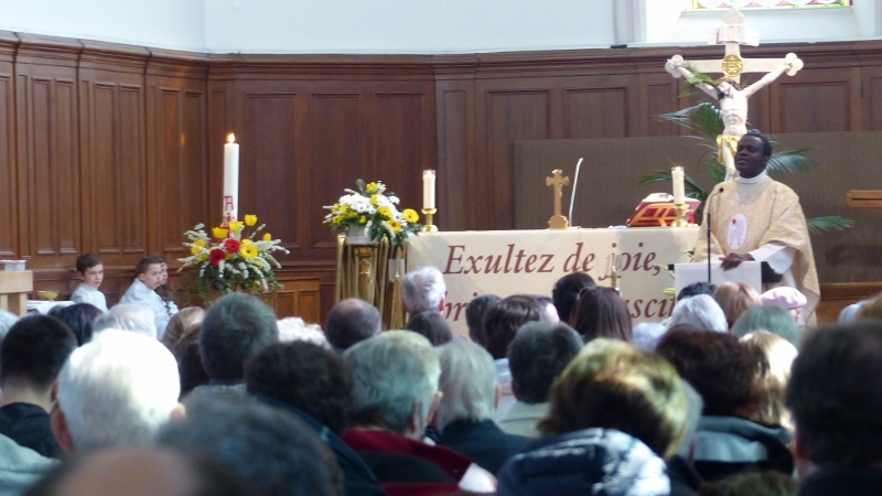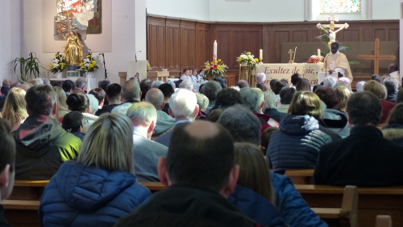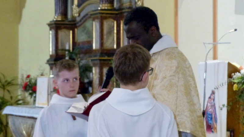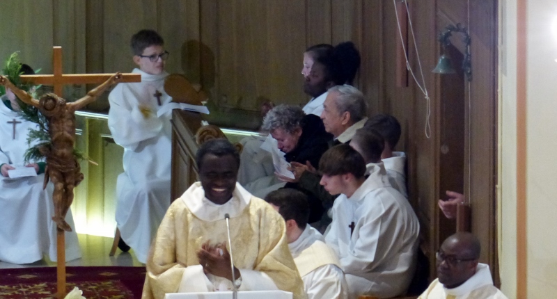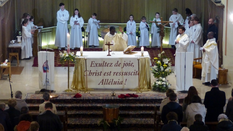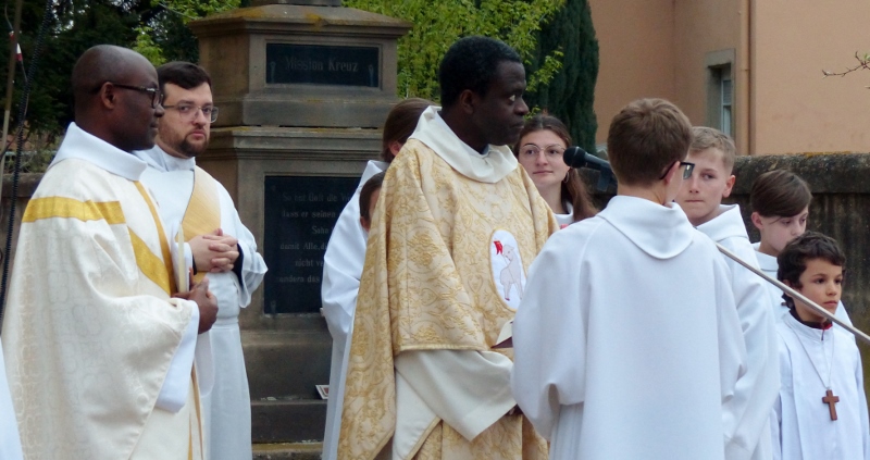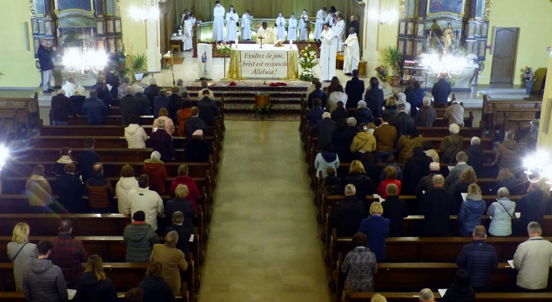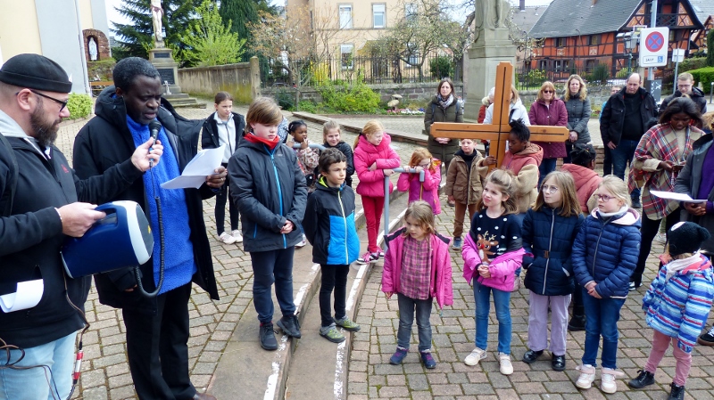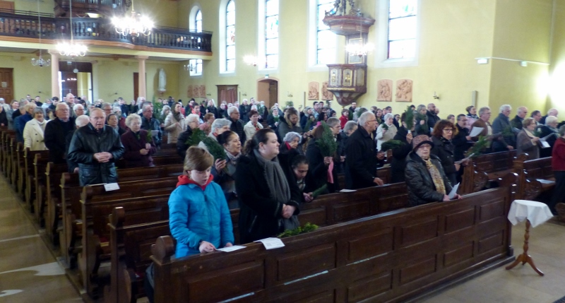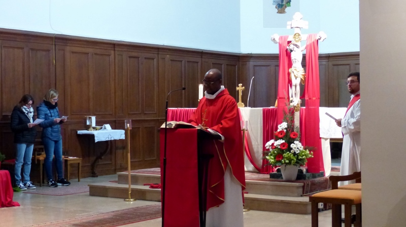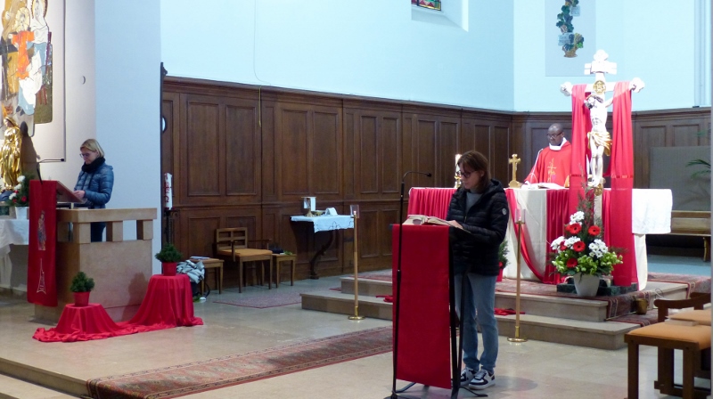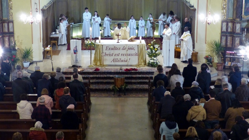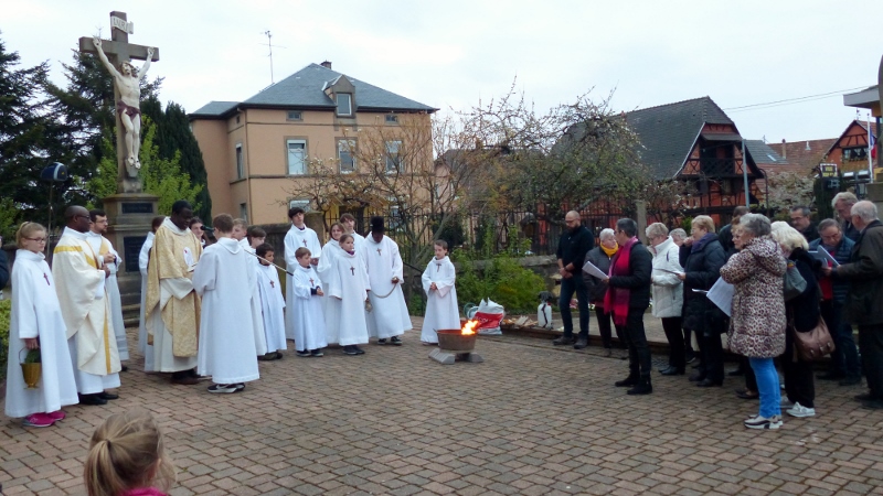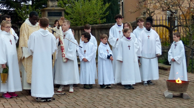 La messe des Rameaux et de la Passion a été présidée le samedi soir à Souffelweyersheim par l’abbé René Awoumé assisté de notre diacre Ephraïm avec au chant la chorale des Coeurs chantants. Le dimanche c’est notre curé l’abbé Gabriel Tchonang qui a officié entouré des diacres Ephraïm et Michel, le papa de notre secrétaire paroissiale Marie Martin, la partie musicale étant assurée par la chorale Sainte-Cécile.