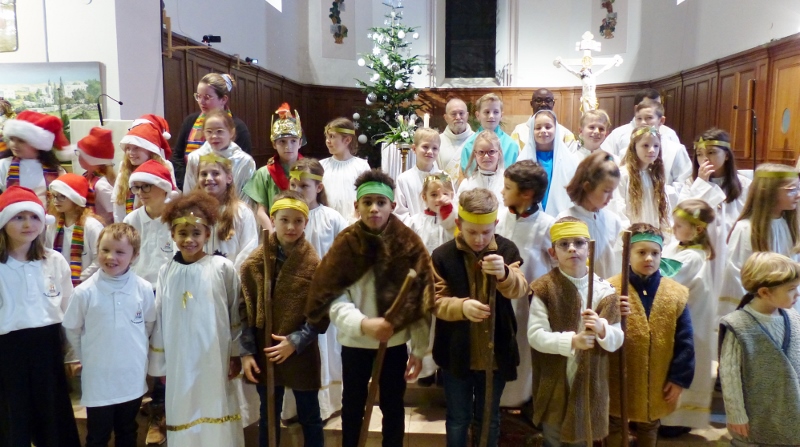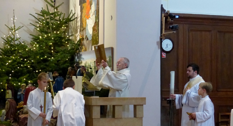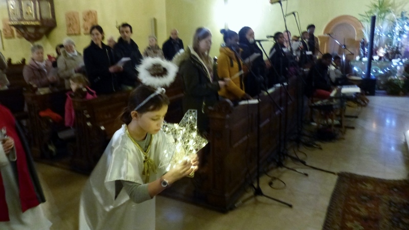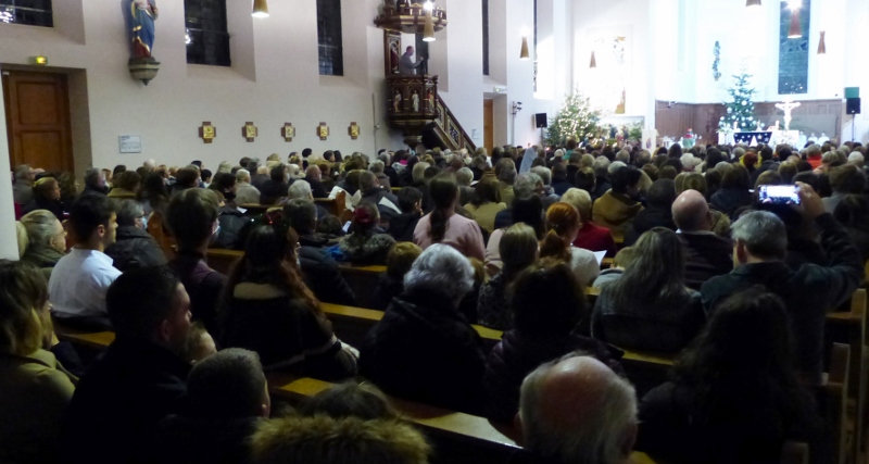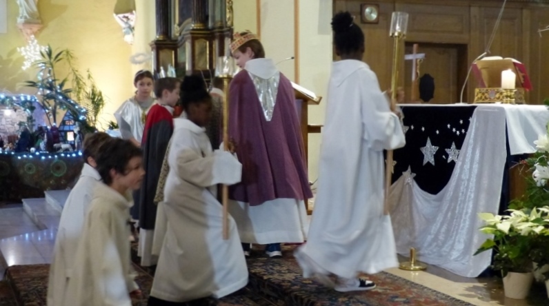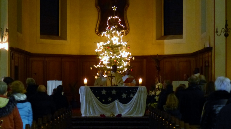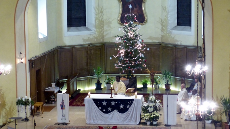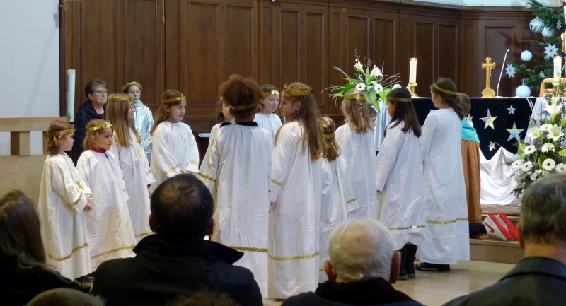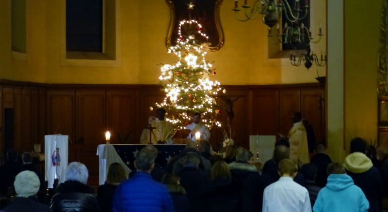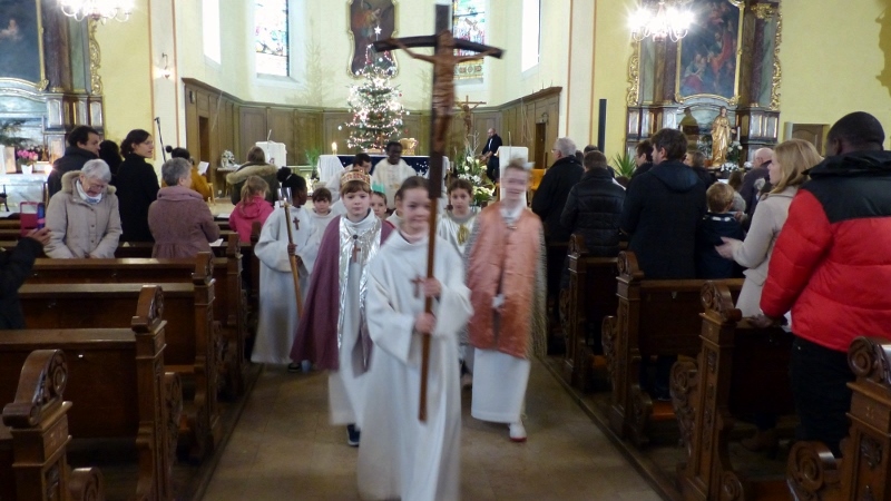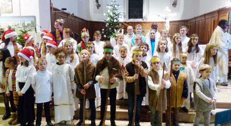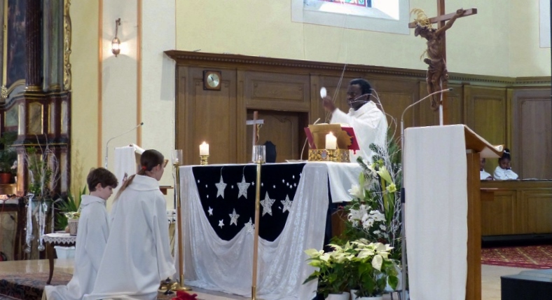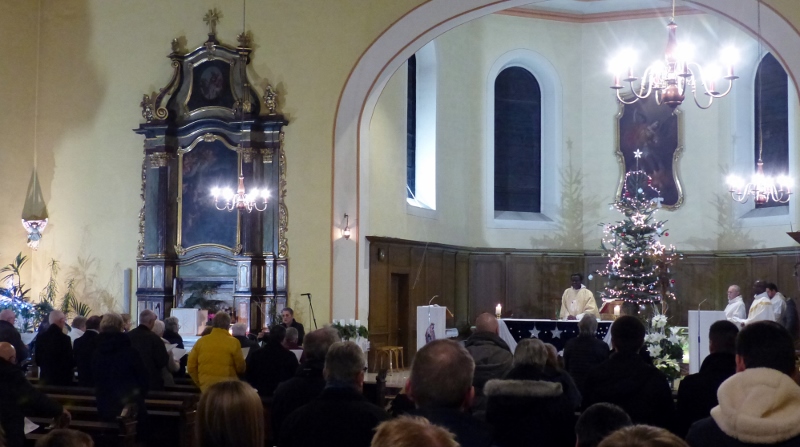 La messe de la veille au soir de Noël, célébrée à Souffel, a connu son affluence habituelle, puisque placée à dix-sept heures elle dégage la soirée pour le réveillon. Animée par la chorale d’enfants et d’adultes D’Haertzengele, elle a été précédée de l’évangile de la Nativité mis en scène et interprété par les enfants (crèche vivante supervisée par Marie-Rose Truck). La messe a été présidée par notre curé, le père Gabriel, concélébrée avec le père René, tous deux assistés des diacres Ephraïm et Michel, le papa de Marie, notre secrétaire paroissiale. Au début le père Gabriel a déposé symboliquement l’Enfant Jésus dans la crèche. Deux frère et soeur, Eliana et Elio, ont communié pour la première fois lors de la messe. A la fin la chorale a interprété dans l’obscurité un pot-pourri de chants de Noël.