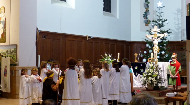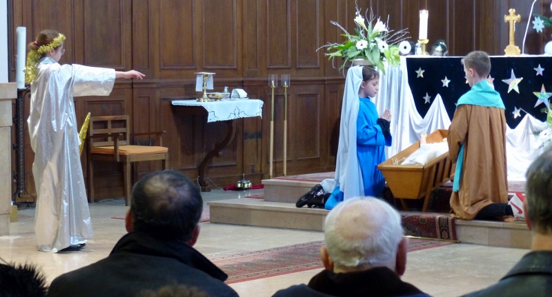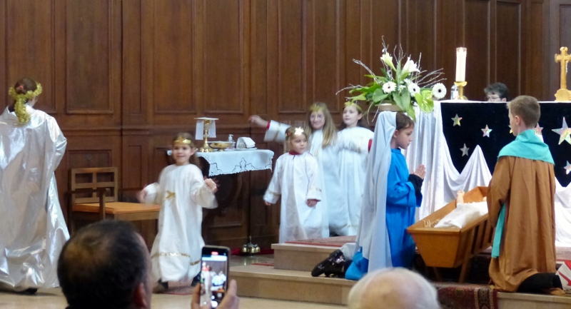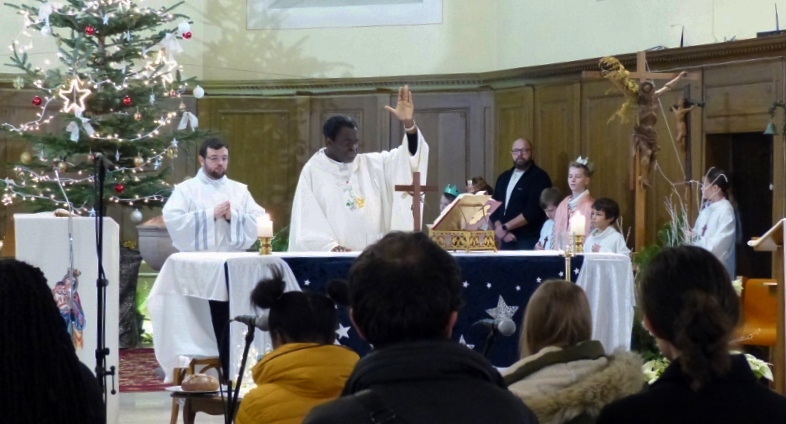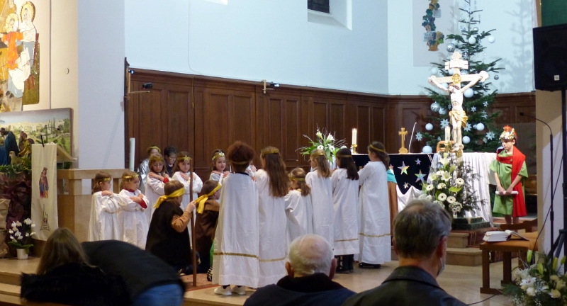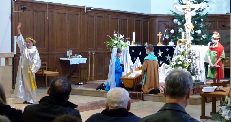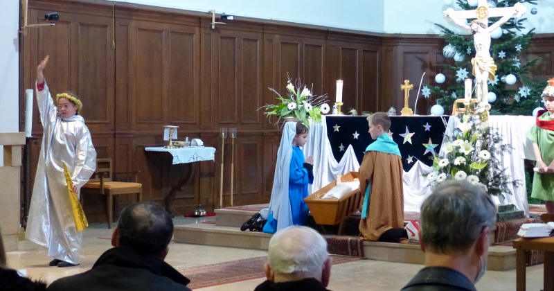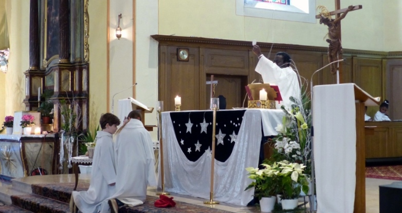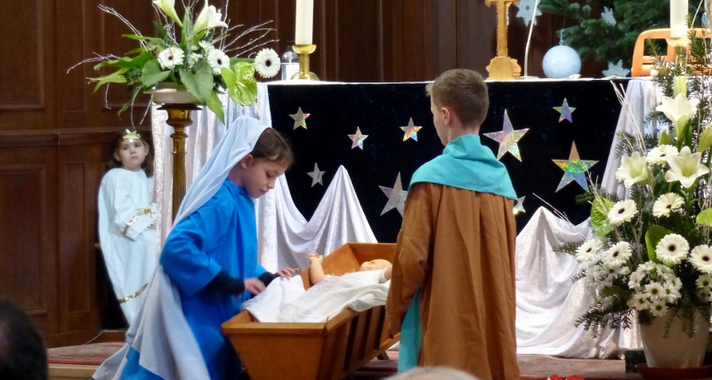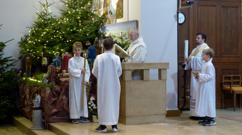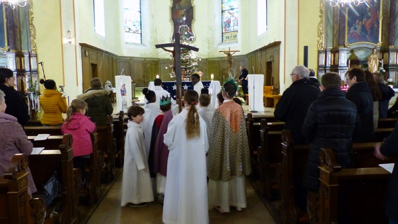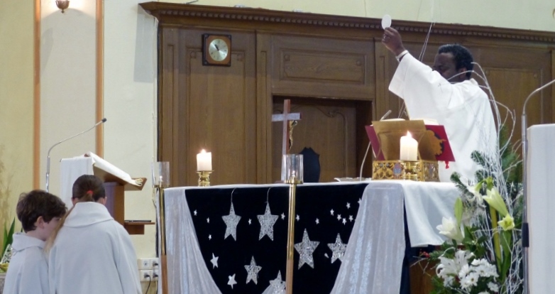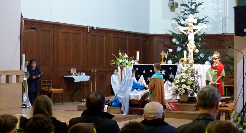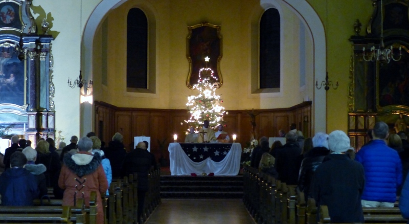 La messe de la veille au soir de Noël, célébrée à Souffel, a connu son affluence habituelle, puisque placée à dix-sept heures elle dégage la soirée pour le réveillon. Animée par la chorale d’enfants et d’adultes D’Haertzengele, elle a été précédée de l’évangile de la Nativité mis en scène et interprété par les enfants (crèche vivante supervisée par Marie-Rose Truck). La messe a été présidée par notre curé, le père Gabriel, concélébrée avec le père René, tous deux assistés des diacres Ephraïm et Michel, le papa de Marie, notre secrétaire paroissiale. Au début le père Gabriel a déposé symboliquement l’Enfant Jésus dans la crèche. Deux frère et soeur, Eliana et Elio, ont communié pour la première fois lors de la messe. A la fin la chorale a interprété dans l’obscurité un pot-pourri de chants de Noël.