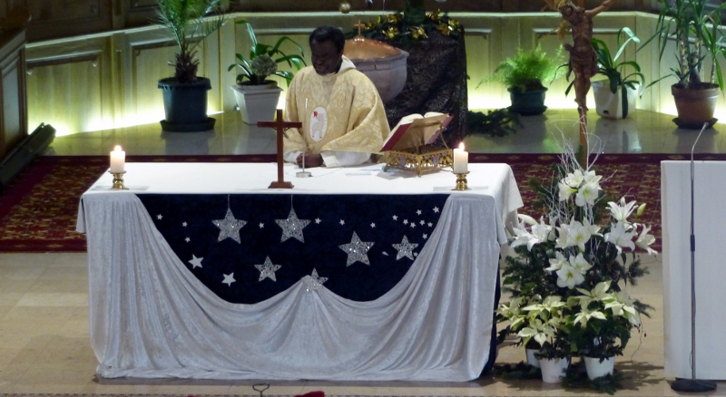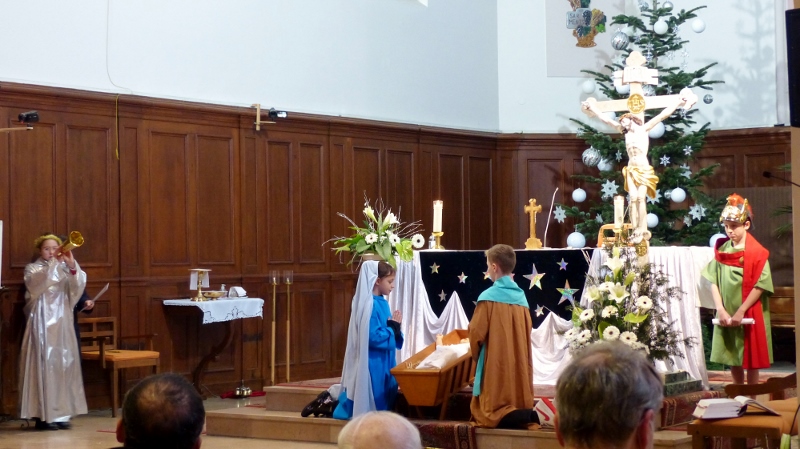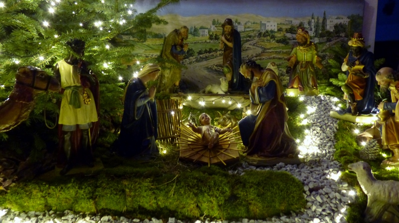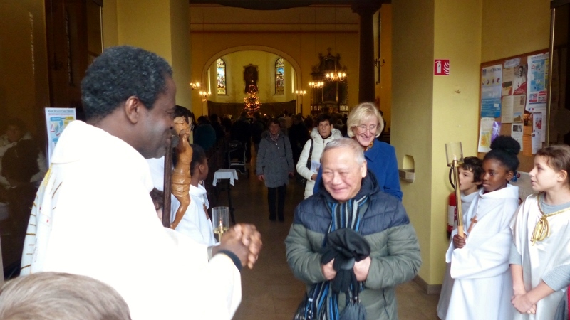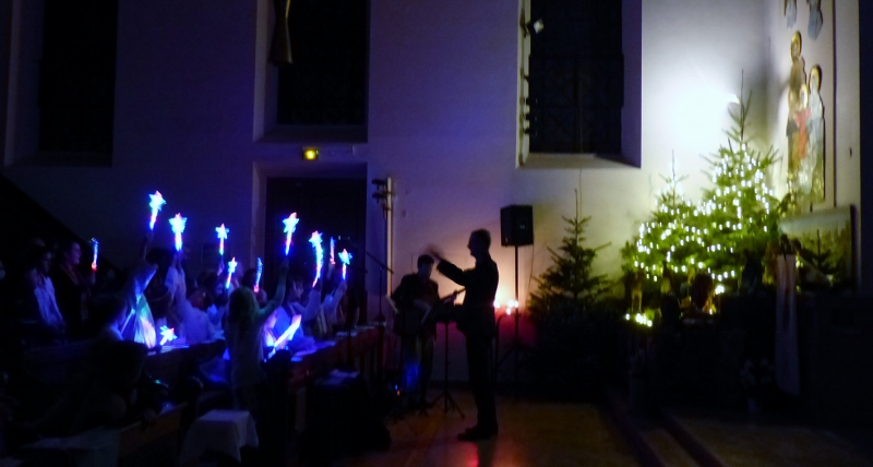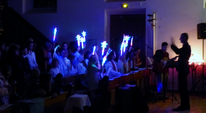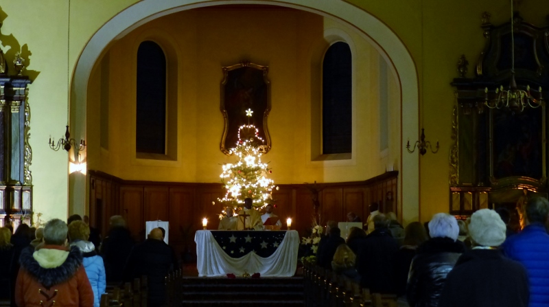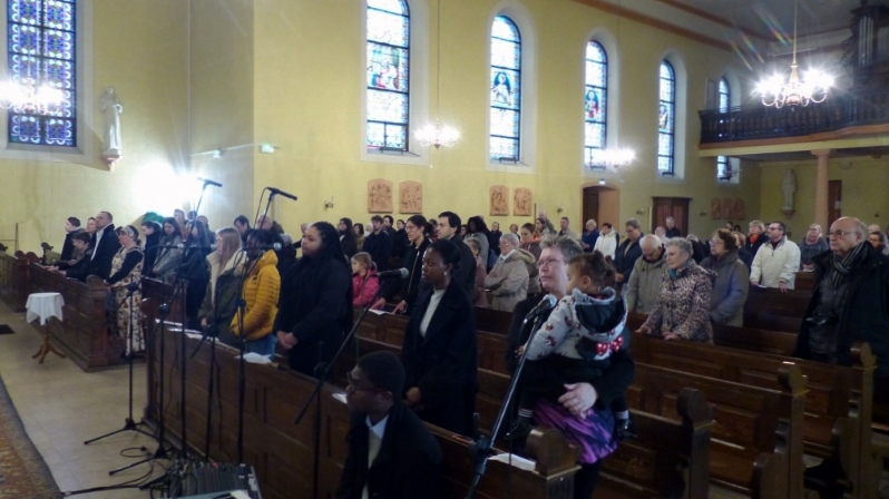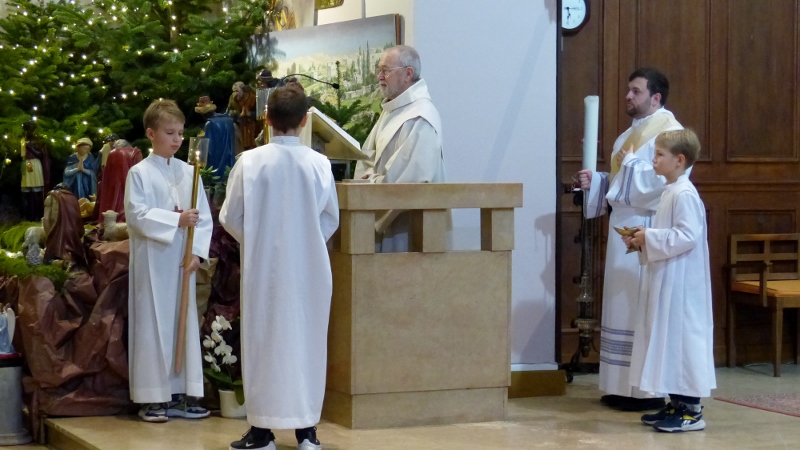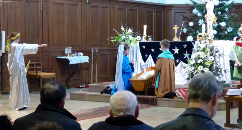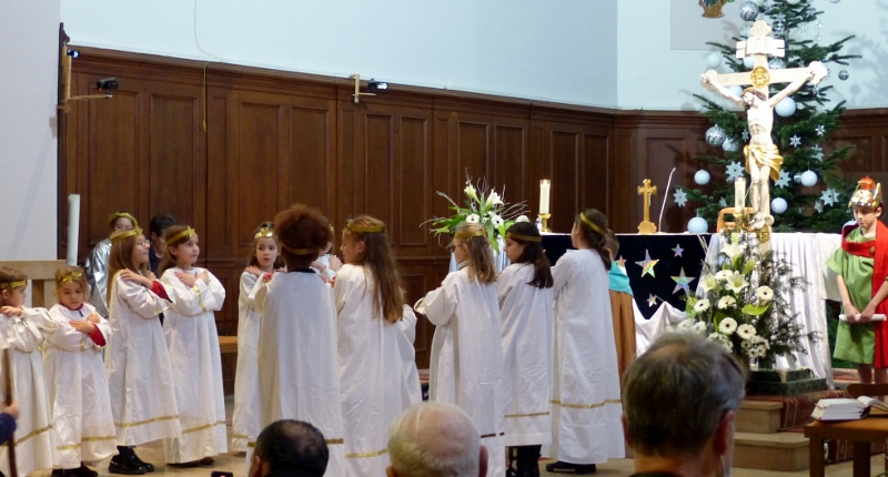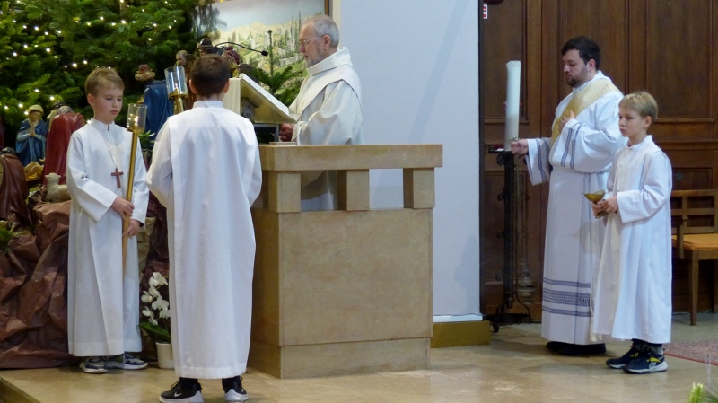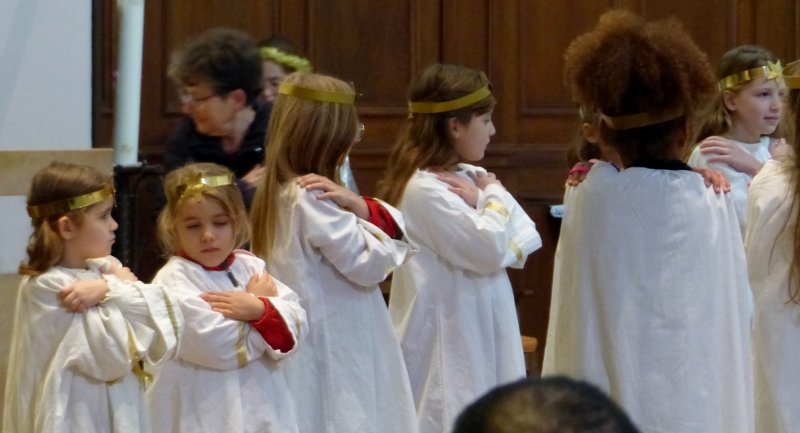 La messe de la veille au soir de Noël, célébrée à Souffel, a connu son affluence habituelle, puisque placée à dix-sept heures elle dégage la soirée pour le réveillon. Animée par la chorale d’enfants et d’adultes D’Haertzengele, elle a été précédée de l’évangile de la Nativité mis en scène et interprété par les enfants (crèche vivante supervisée par Marie-Rose Truck). La messe a été présidée par notre curé, le père Gabriel, concélébrée avec le père René, tous deux assistés des diacres Ephraïm et Michel, le papa de Marie, notre secrétaire paroissiale. Au début le père Gabriel a déposé symboliquement l’Enfant Jésus dans la crèche. Deux frère et soeur, Eliana et Elio, ont communié pour la première fois lors de la messe. A la fin la chorale a interprété dans l’obscurité un pot-pourri de chants de Noël.