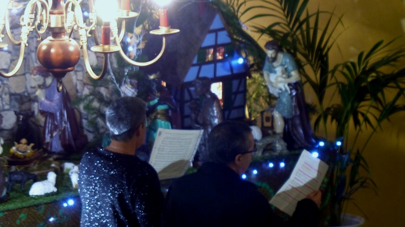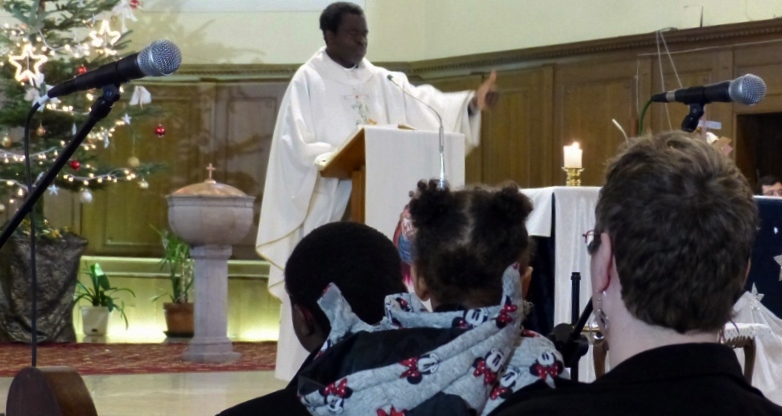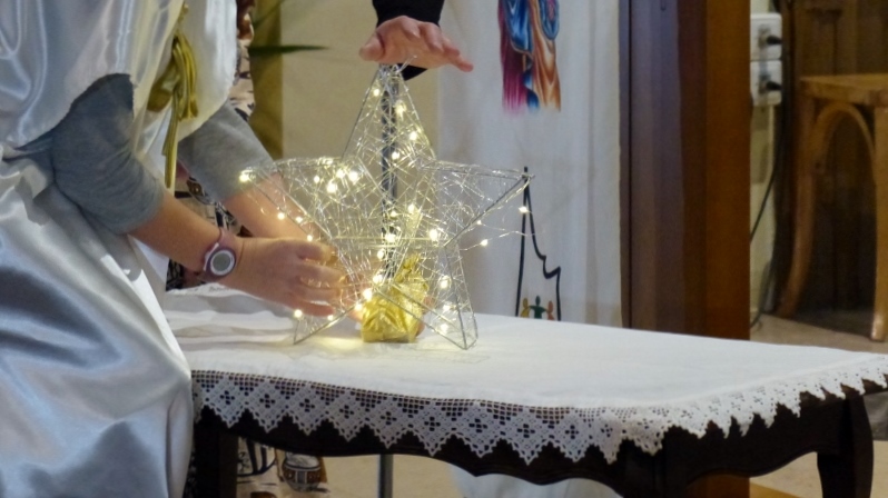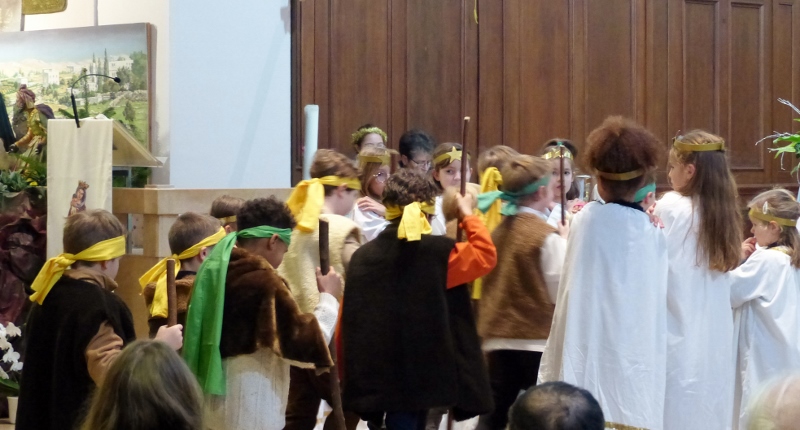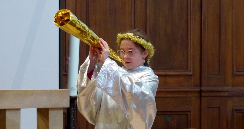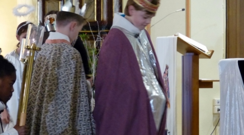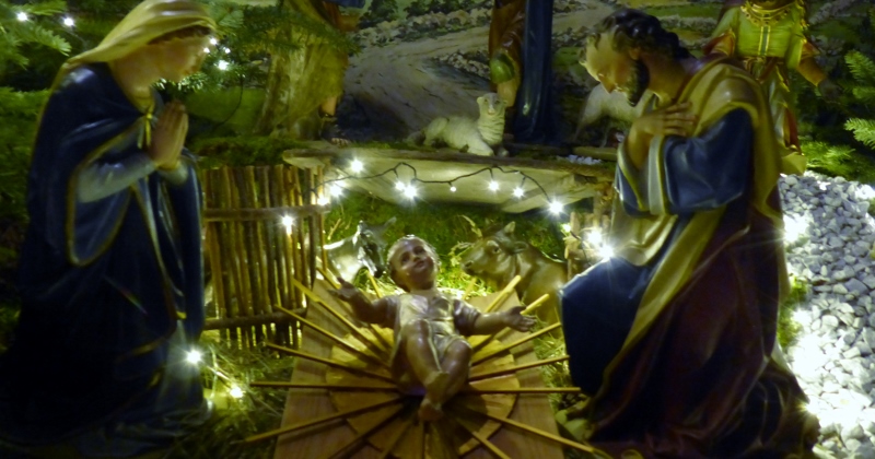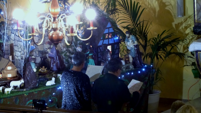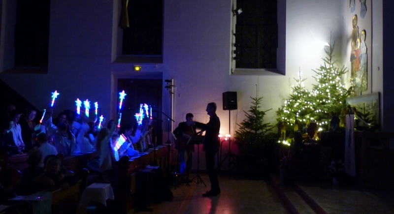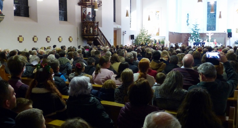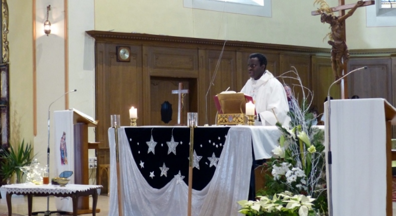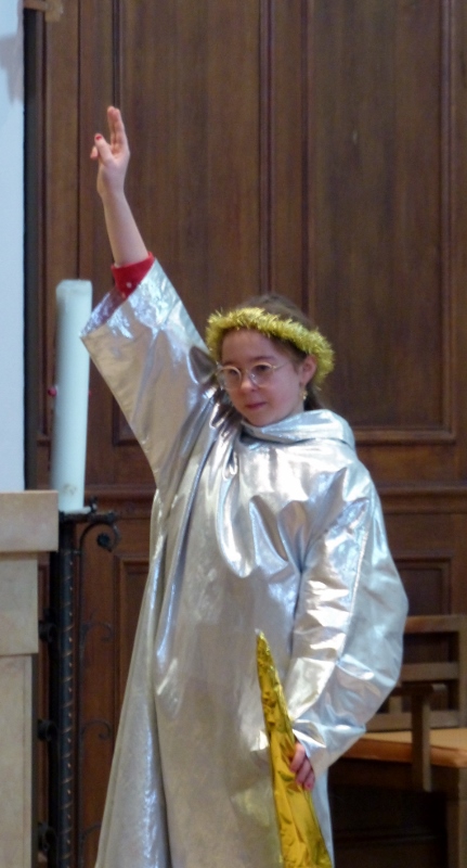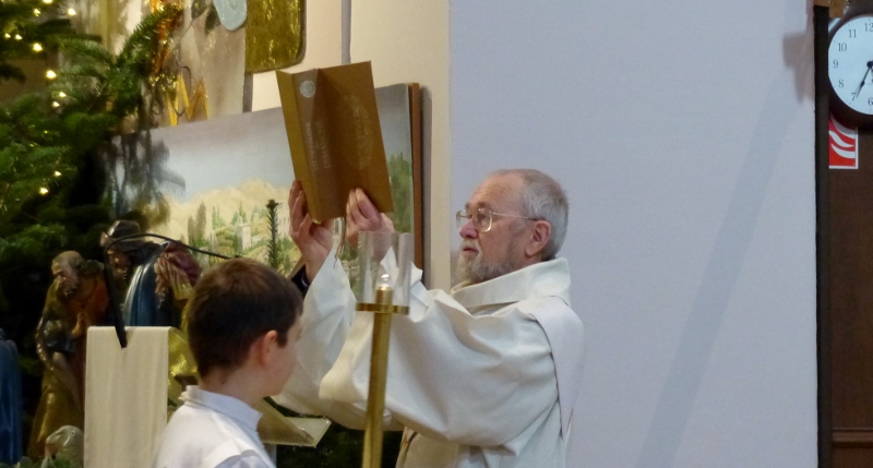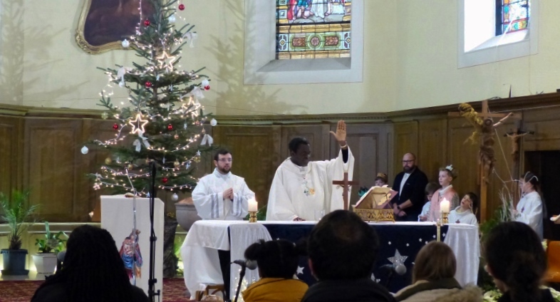 La messe de la veille au soir de Noël, célébrée à Souffel, a connu son affluence habituelle, puisque placée à dix-sept heures elle dégage la soirée pour le réveillon. Animée par la chorale d’enfants et d’adultes D’Haertzengele, elle a été précédée de l’évangile de la Nativité mis en scène et interprété par les enfants (crèche vivante supervisée par Marie-Rose Truck). La messe a été présidée par notre curé, le père Gabriel, concélébrée avec le père René, tous deux assistés des diacres Ephraïm et Michel, le papa de Marie, notre secrétaire paroissiale. Au début le père Gabriel a déposé symboliquement l’Enfant Jésus dans la crèche. Deux frère et soeur, Eliana et Elio, ont communié pour la première fois lors de la messe. A la fin la chorale a interprété dans l’obscurité un pot-pourri de chants de Noël.