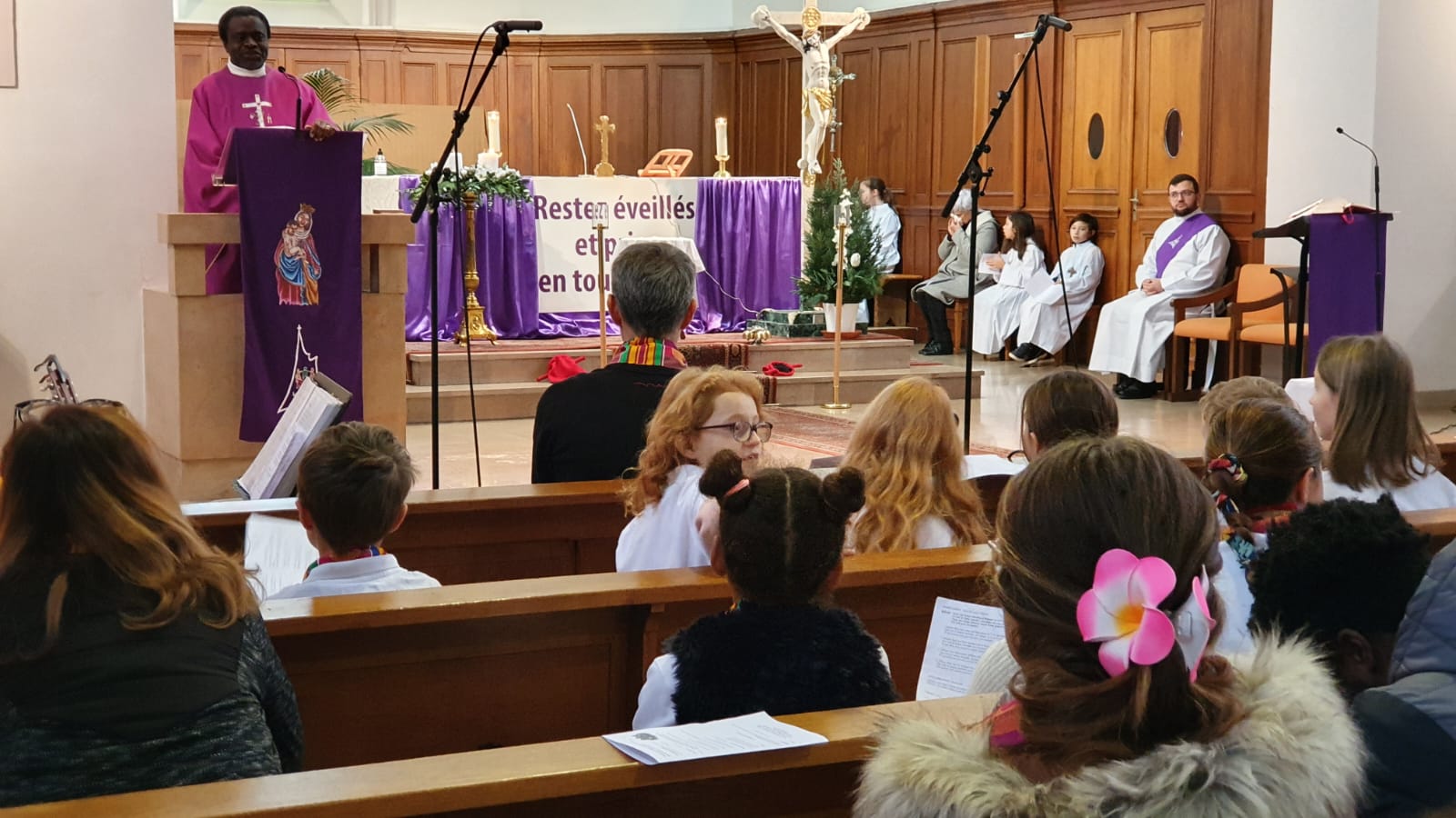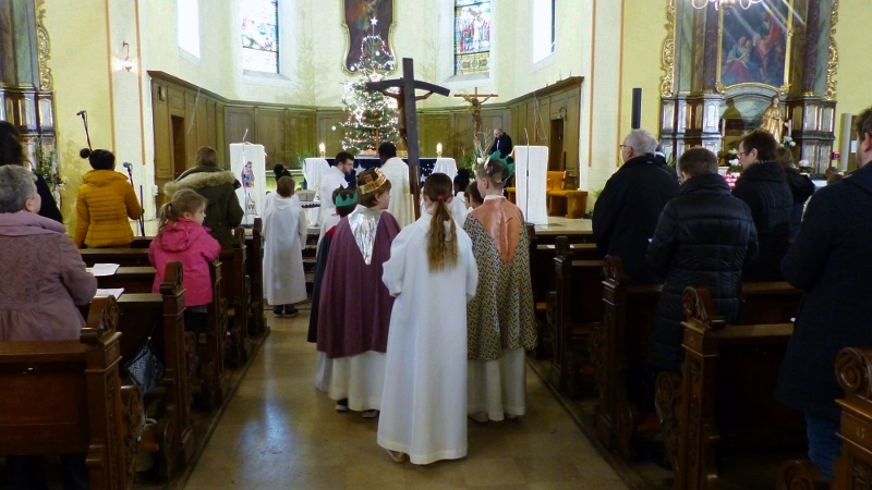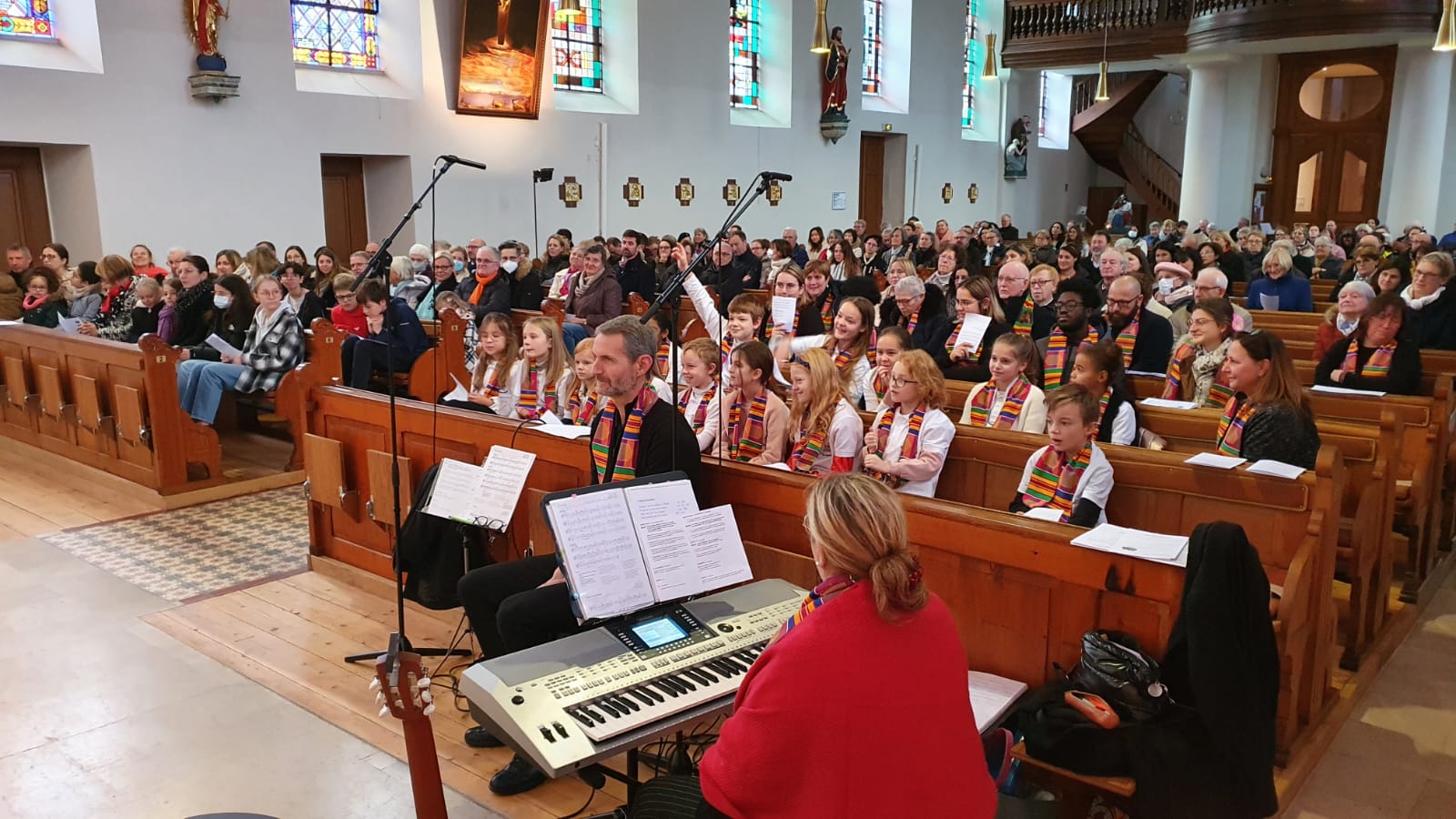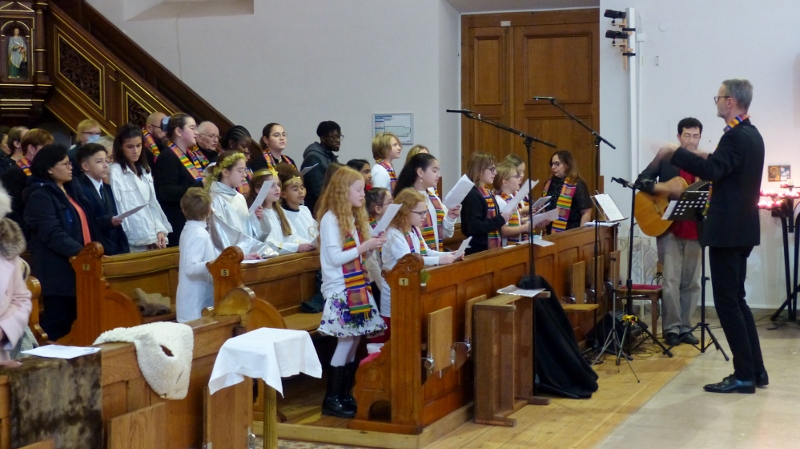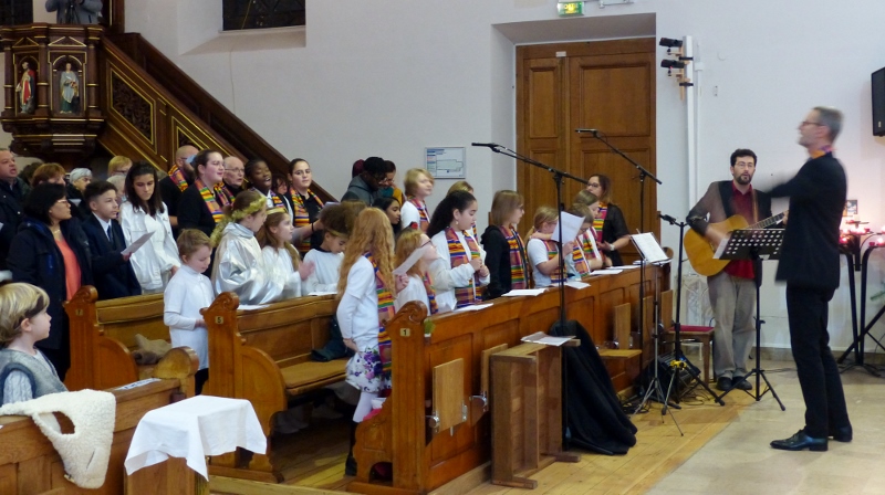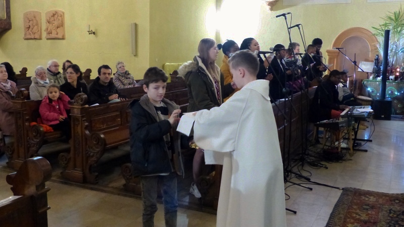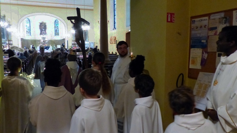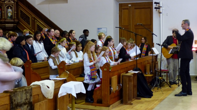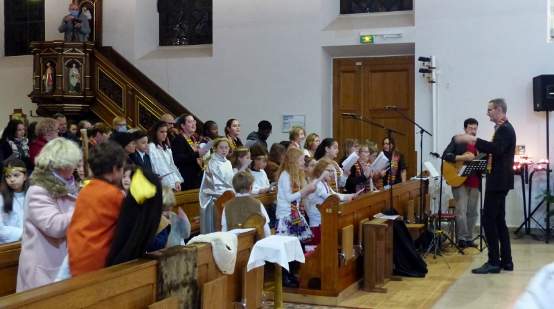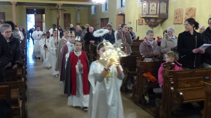 La messe dite « du retour des mages » a été célébrée le dimanche de l’Epiphanie à Reichstett. La procession d’entrée, avec trois garçons costumés en rois mages, a permis de déposer une étoile lumineuse devant l’autel. La chorale des Séraphins renforcée d’un djembé (tambour africain) a animé avec beaucoup d’entrain la célébration. La procession des offrandes a été faite par des enfants.