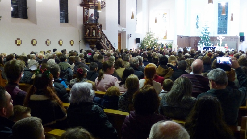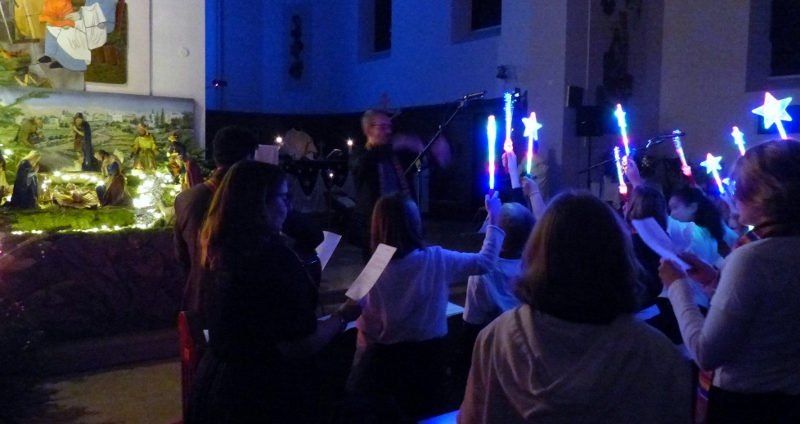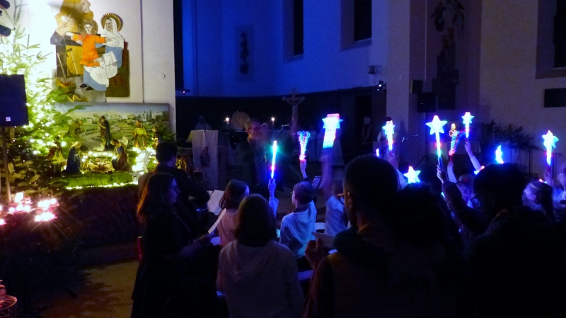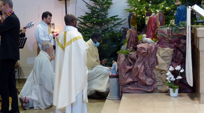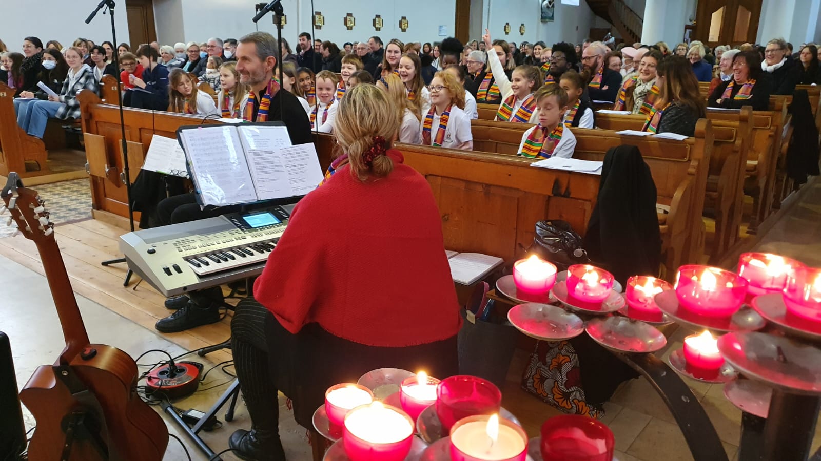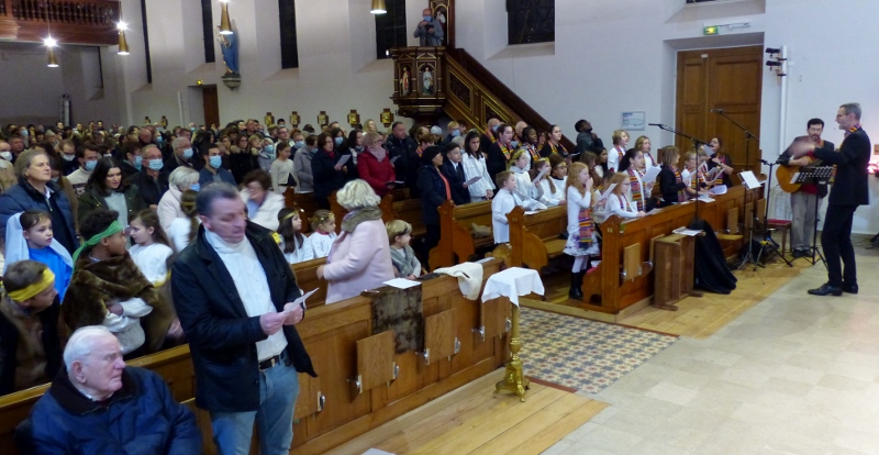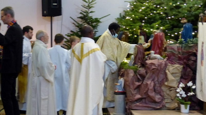 Nos prêtres et diacres étaient de nouveau présents à la messe de minuit, célébrée à Reichstett. Animée par la chorale Sainte-Cécile, elle a été marquée par un chant de Noël interprété à la crèche par Isabelle, notre chef de choeur, et son époux Denis Schreiber. Le chant final Les anges dans nos campagnes a été interprrété dans l’église plongée dans l’obscurité.