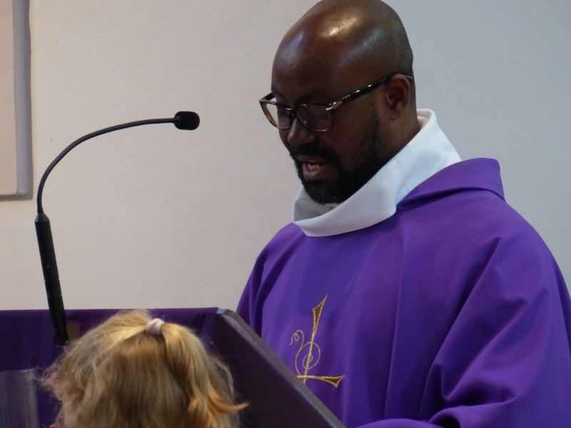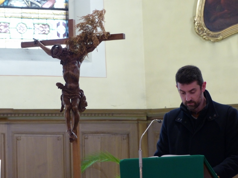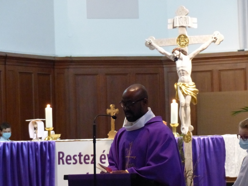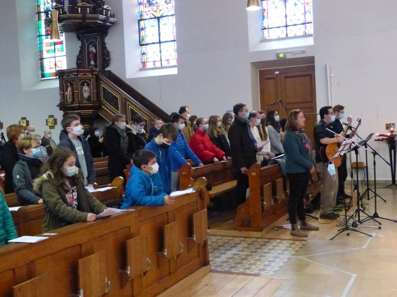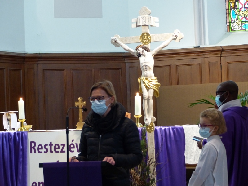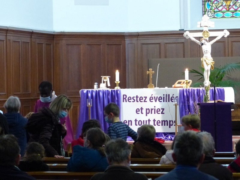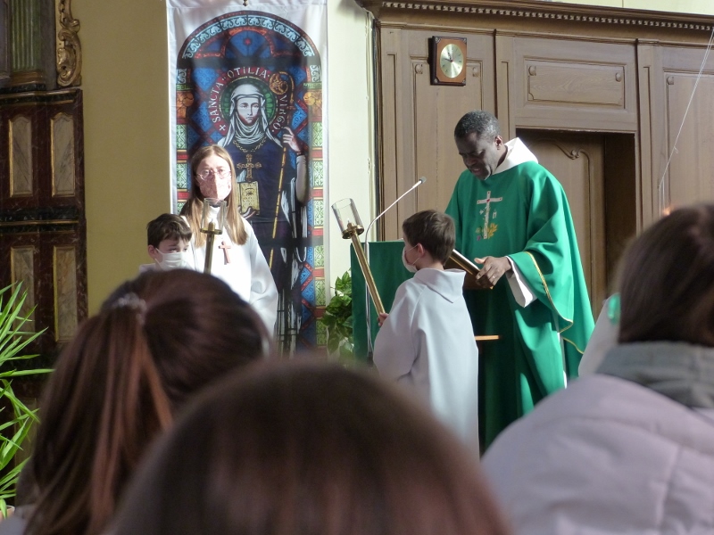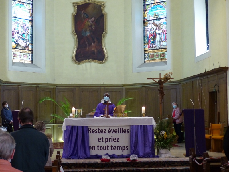 La messe du cinquième dimanche de Carême était aussi le dimanche matin la messe mensuelle des familles. Animée par la chorale Vases d’argile qui remplaçait au pied levé d’Haetzengele décimée par la maladie, elle fut présidée par l’abbé René. L’assistance était nombreuse : il y avait tout juste assez de feuilles de chant pour tout le monde !